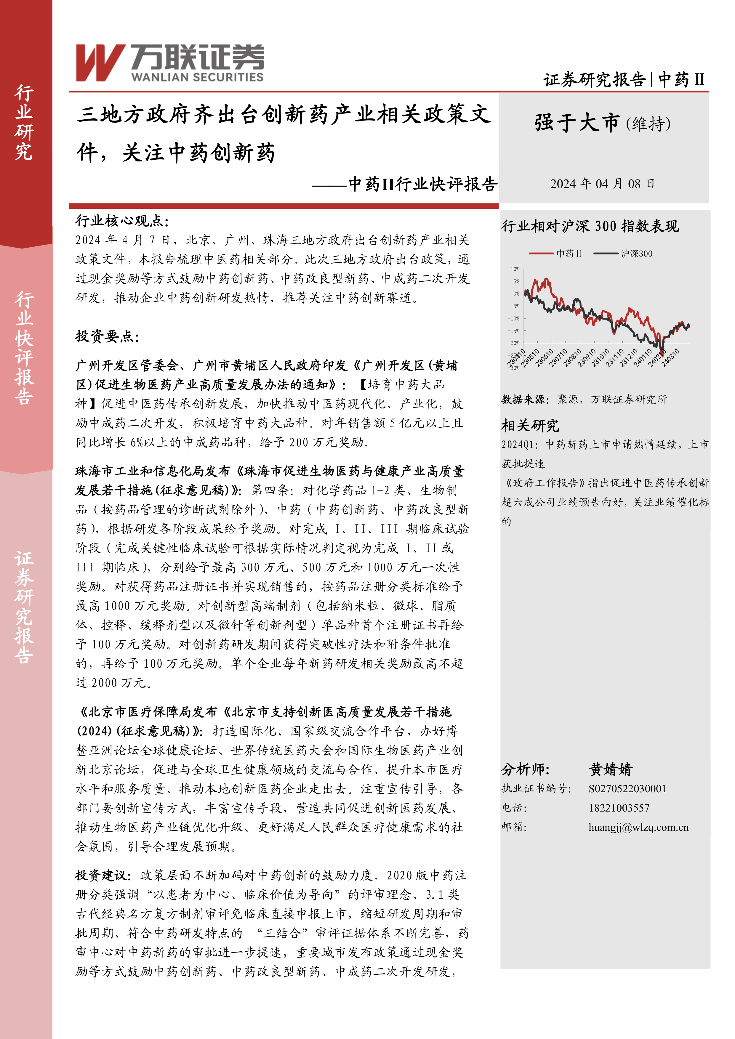 本报告分析了北京、广州、珠海三地政府近期出台的创新药产业相关政策,重点关注其对中药行业的影响。这些政策通过现金奖励等方式,大力扶持中药创新,预计将显著提升中药企业研发热情,加速中药创新药及改良型新药的研发和上市进程。 结合国家层面已有的政策支持,中药行业未来发展前景向好。 但投资者仍需谨慎评估相关风险,理性投资。 本报告仅供参考,不构成投资建议。