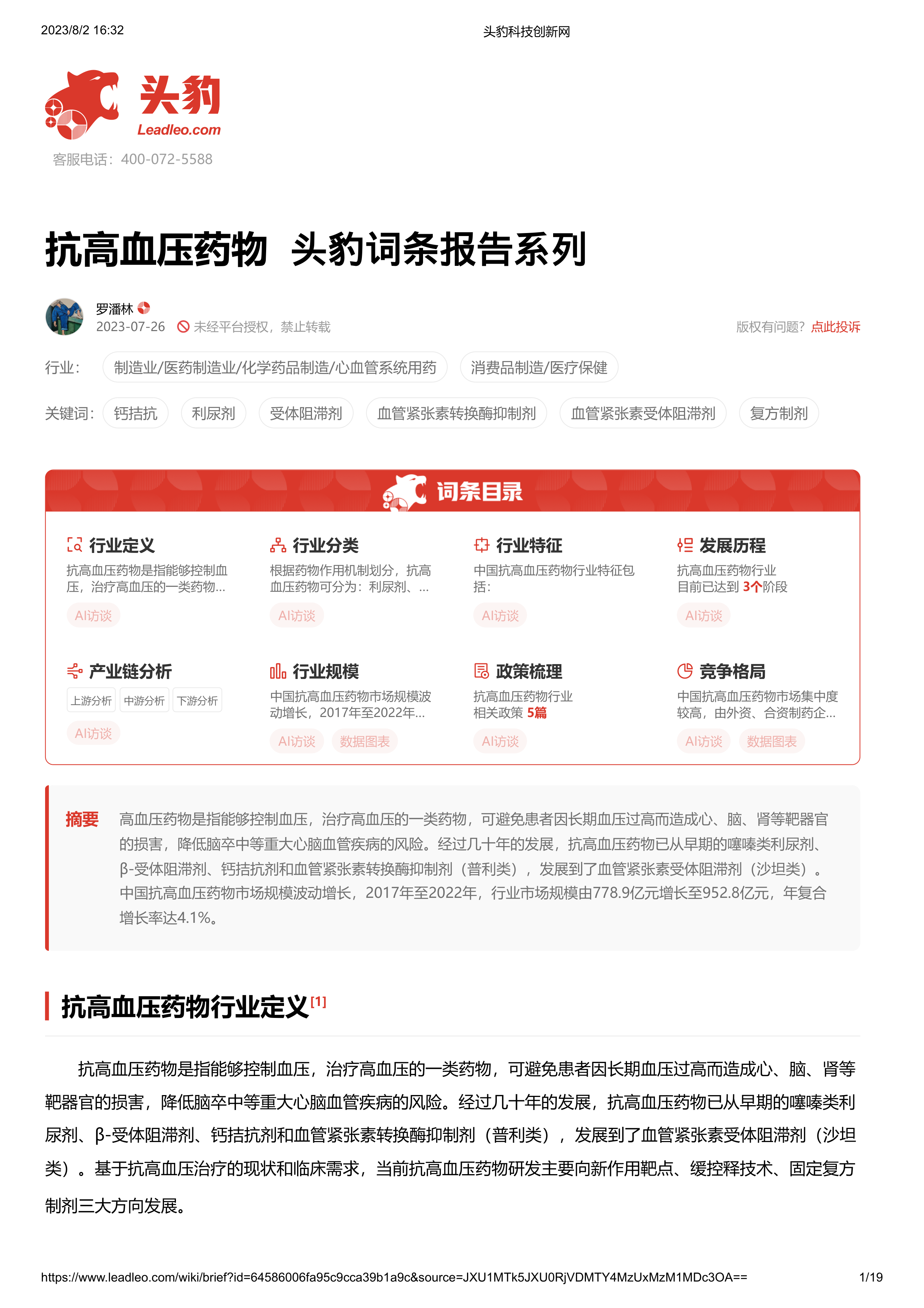 本报告基于头豹科技创新网提供的抗高血压药物行业报告数据,对中国抗高血压药物市场进行分析。报告核心观点如下: