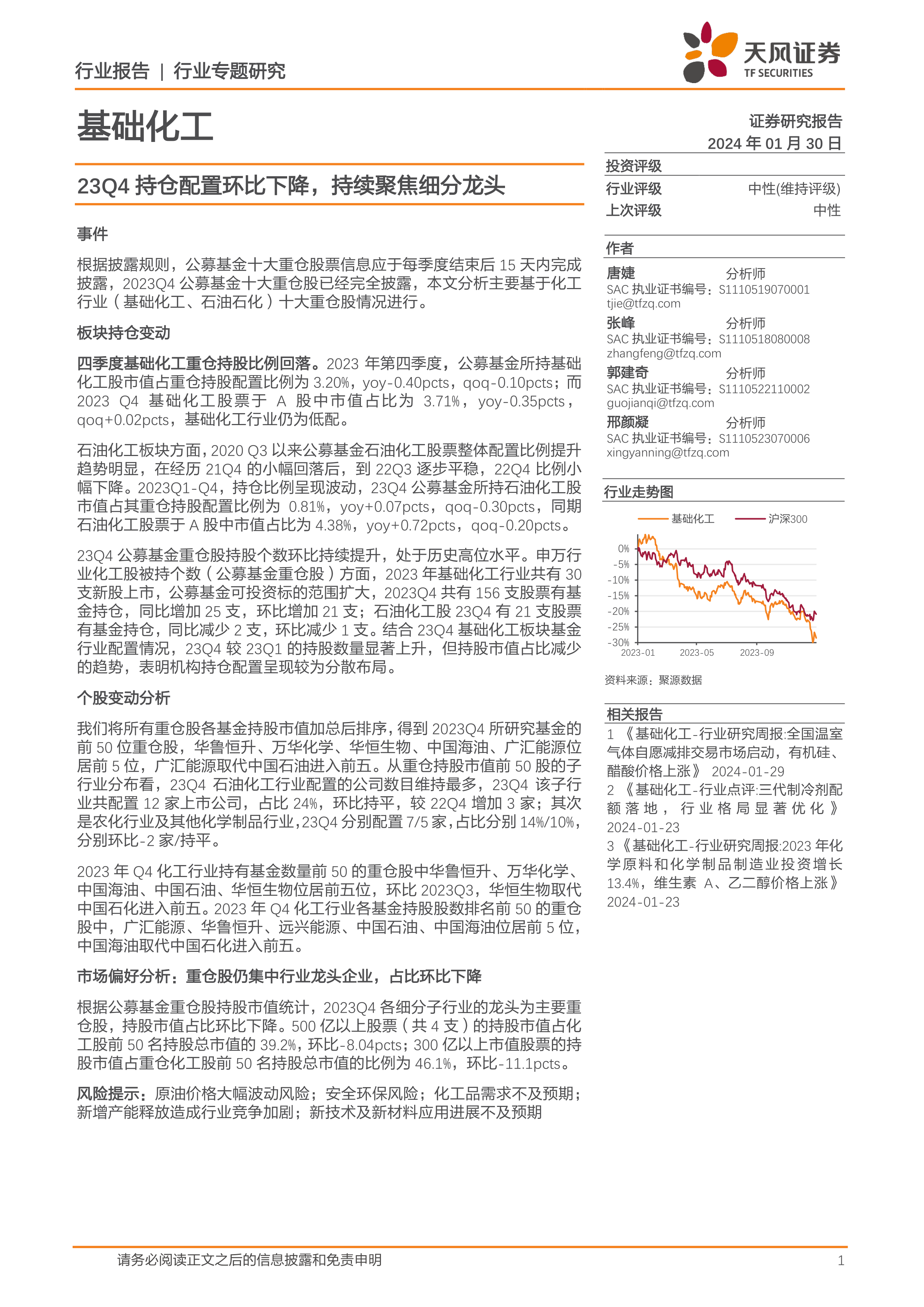 本报告基于2023年第四季度公募基金十大重仓股信息,对基础化工和石油化工行业进行市场分析。核心观点如下: