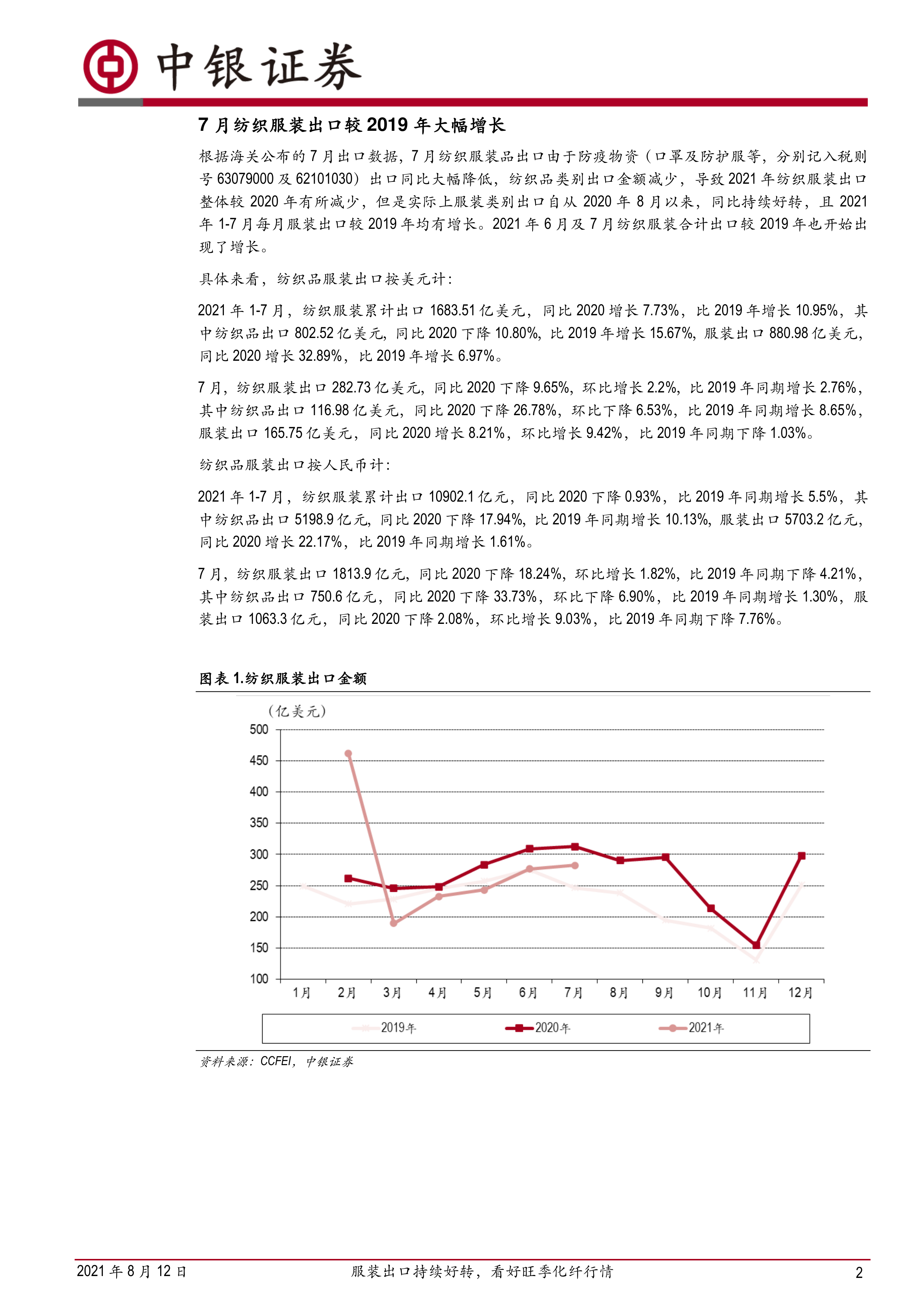 本报告的核心观点是:中国纺织服装出口持续向好,化纤行业淡季不淡,旺季行情值得期待。 具体而言,报告基于2021年1-7月纺织服装出口数据、化纤产品价格走势、行业库存和开工率等数据,分析了纺织服装行业和化纤行业的市场现状及未来走势,并提出了相应的投资建议。