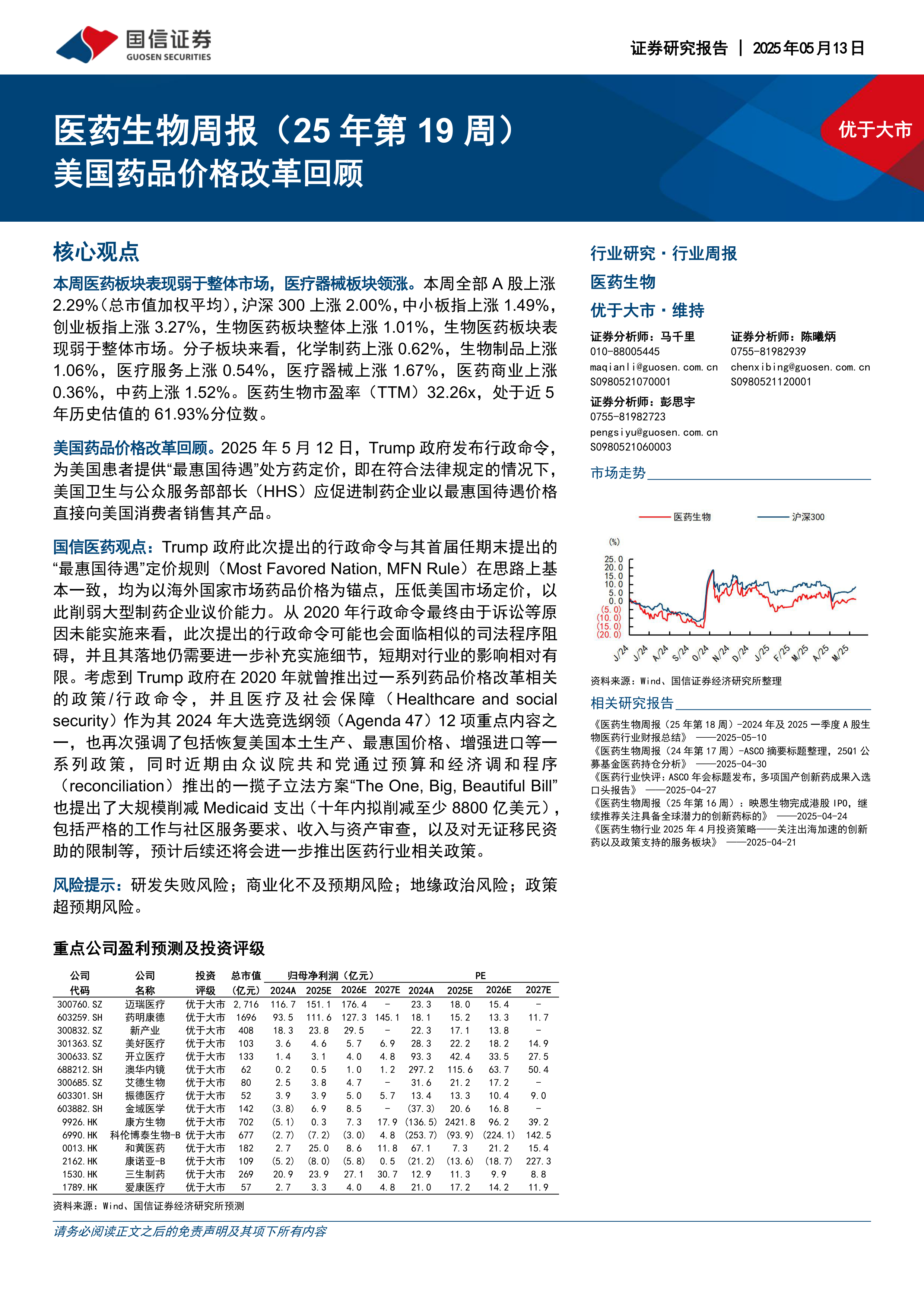国信医药观点:Trump政府此次提出的行政命令与其首届任期末提出的“最惠国待遇”定价规则(MostFavoredNation,MFNRule)在思路上基本一致,均为以海外国家市场药品价格为锚点,压低美国市场定价,以此削弱大型制药企业议价能力。从2020年行政命令最终由于诉讼等原因未能实施来看,此次提出的行政命令可能也会面临相似的司法程序阻碍,并且其落地仍需要进一步补充实施细节,短期对行业的影响相对有限。考虑到Trump政府在2020年就曾推出过一系列药品价格改革相关的政策/行政命令,并且医疗及社会保障(Healthcare and socialsecurity)作为其2024年大选竞选纲领(Agenda47)12项重点内容之一,也再次强调了包括恢复美国本土生产、最惠国价格、增强进口等一系列政策,同时近期由众议院共和党通过预算和经济调和程序(reconciliation)推出的一揽子立法方案“The One,Big,Beautiful Bill”也提出了大规模削减Medicaid支出(十年内拟削减至少8800亿美元)包括严格的工作与社区服务要求、收入与资产审查,以及对无证移民资助的限制等,预计后续还将会进一步推出医药行业相关政策。