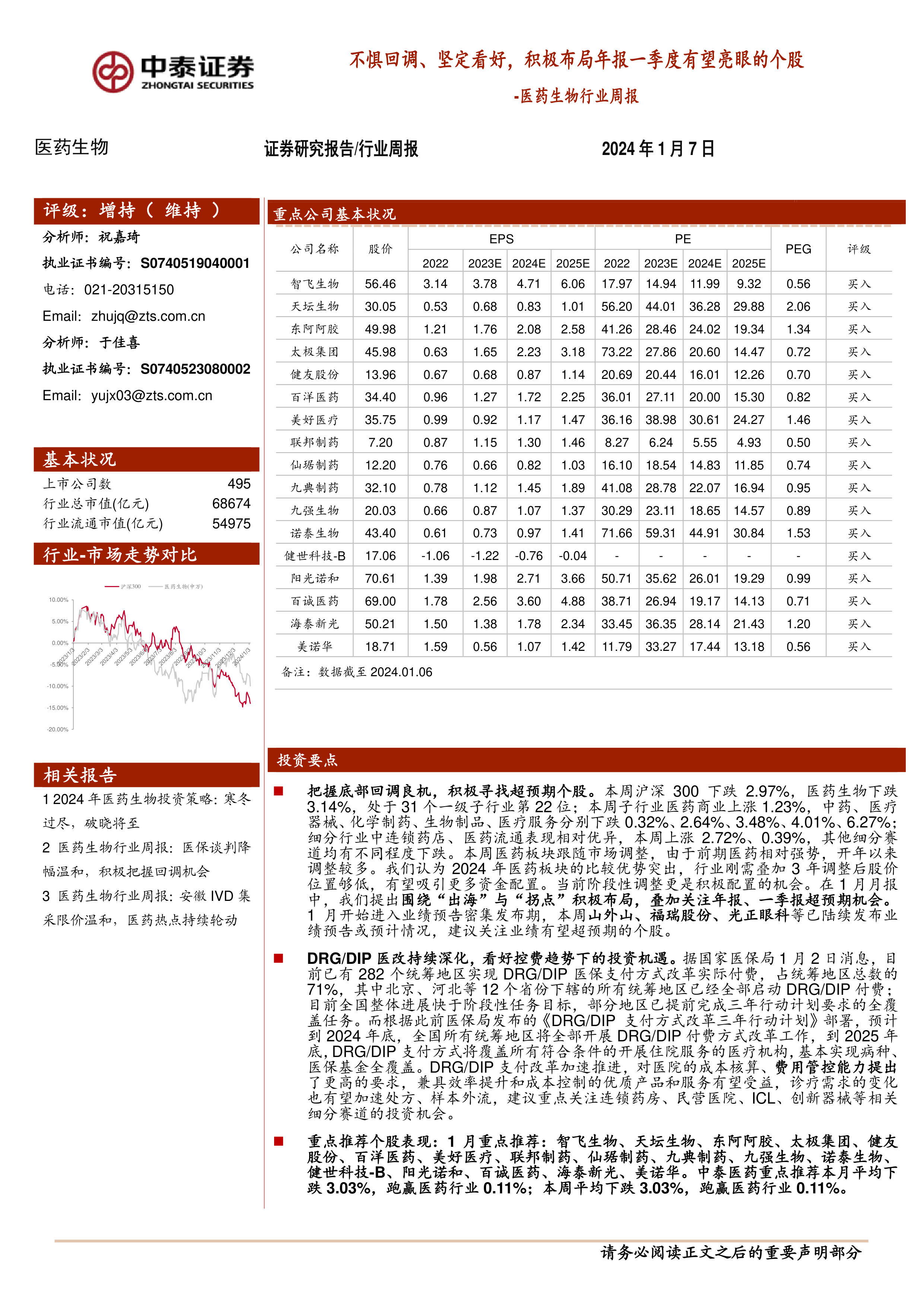 本报告的核心观点是:尽管本周医药生物板块跟随市场调整,出现阶段性回调,但2024年医药板块的长期投资价值依然突出。报告建议投资者把握底部回调良机,积极布局年报和一季报有望超预期的个股,并重点关注DRG/DIP医改带来的投资机遇。