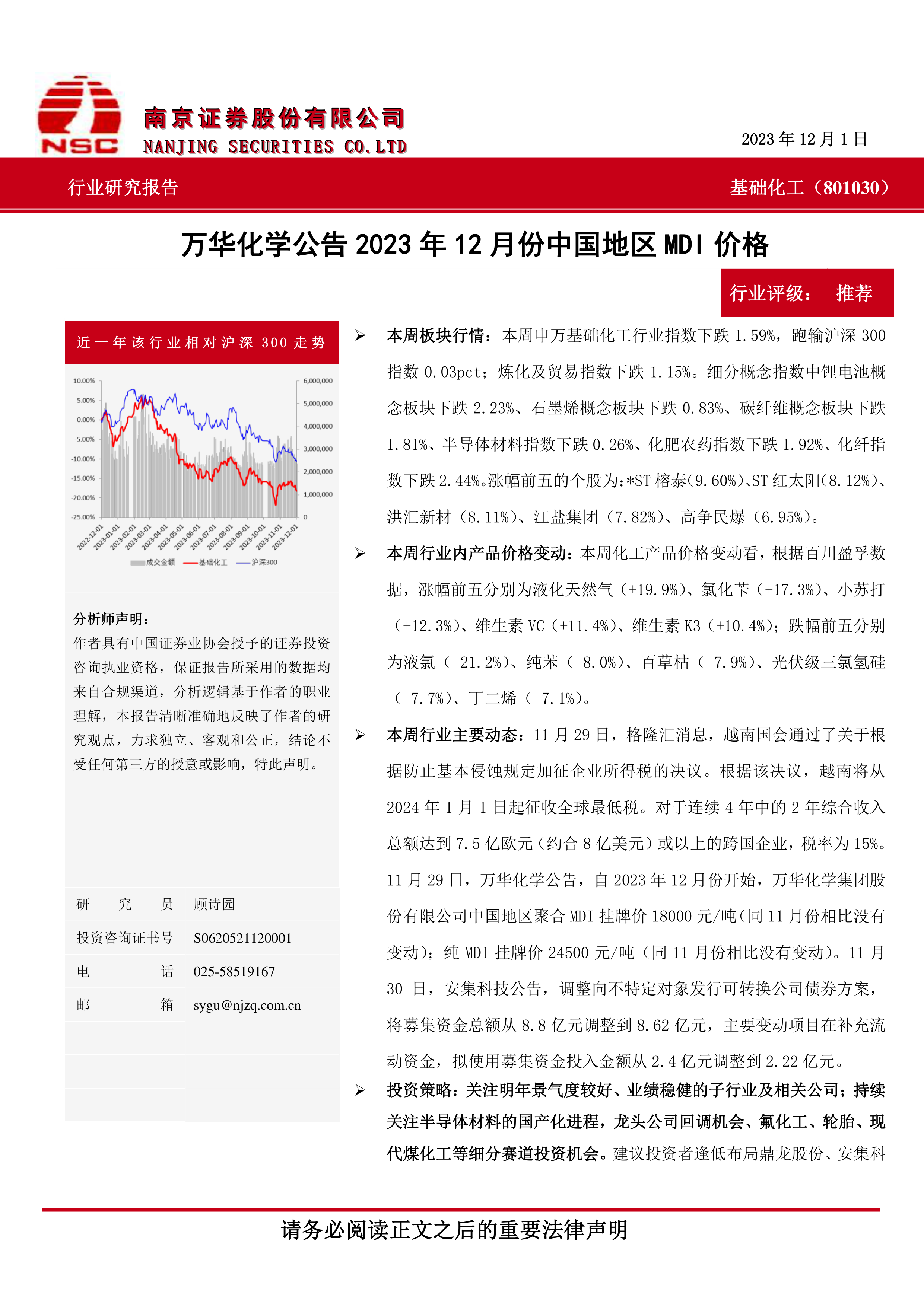 本周行业主要动态:11月29日,格隆汇消息,越南国会通过了关于根据防止基本侵蚀规定加征企业所得税的决议。根据该决议,越南将从2024年1月1日起征收全球最低税。对于连续4年中的2年综合收入总额达到7.5亿欧元(约合8亿美元)或以上的跨国企业,税率为15%。11月29日,万华化学公告,自2023年12月份开始,万华化学集团股份有限公司中国地区聚合MDI挂牌价18000元/吨(同11月份相比没有变动);纯MDI挂牌价24500元/吨(同11月份相比没有变动)。11月30日,安集科技公告,调整向不特定对象发行可转换公司债券方案,将募集资金总额从8.8亿元调整到8.62亿元,主要变动项目在补充流动资金,拟使用募集资金投入金额从2.4亿元调整到2.22亿元。