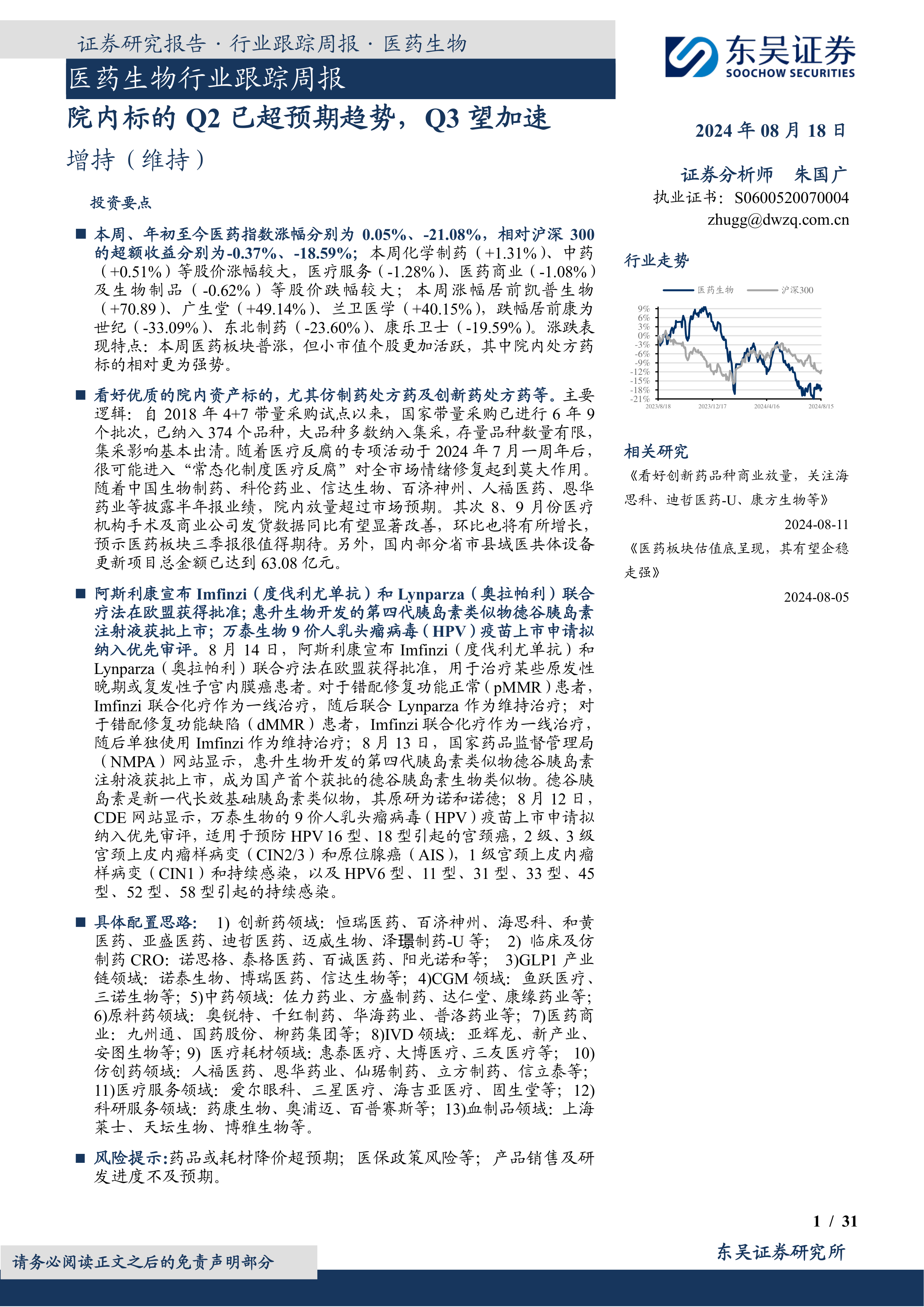本报告详细跟踪了医药生物行业,特别是院内标的的市场表现和未来趋势。报告内容涵盖以下几个方面: