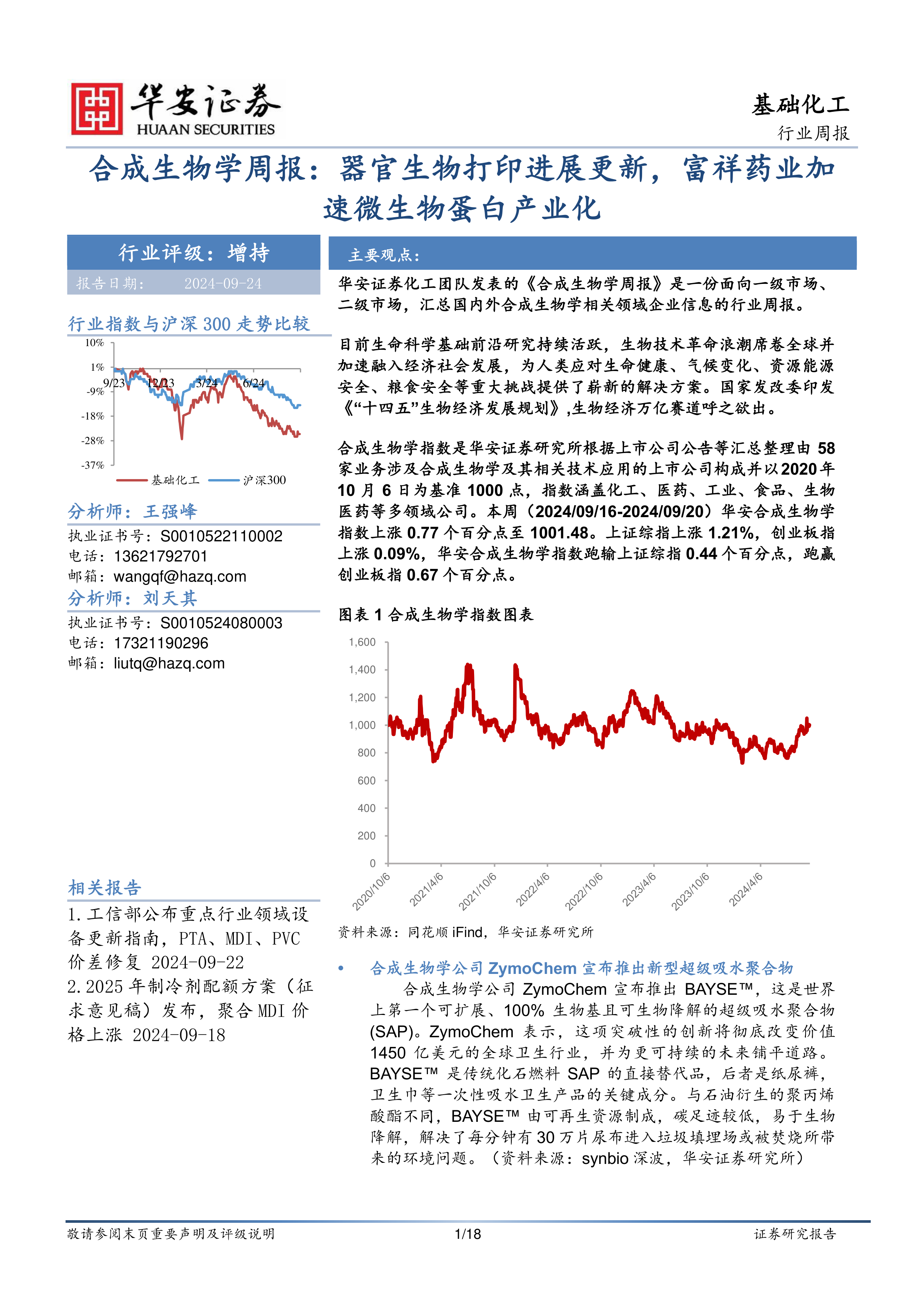 本报告的核心观点是:合成生物学行业发展迅速,市场潜力巨大,但同时也面临诸多挑战。二级市场表现方面,华安合成生物学指数本周表现略逊于上证综指,但跑赢创业板指。行业内公司业务进展积极,融资活动频繁,研发方向多元化,科研动态活跃。器官生物打印作为合成生物学的重要应用领域,展现出广阔前景,但仍面临技术瓶颈。富祥药业在微生物蛋白产业化方面取得突破,获得政府补助,成为行业亮点。