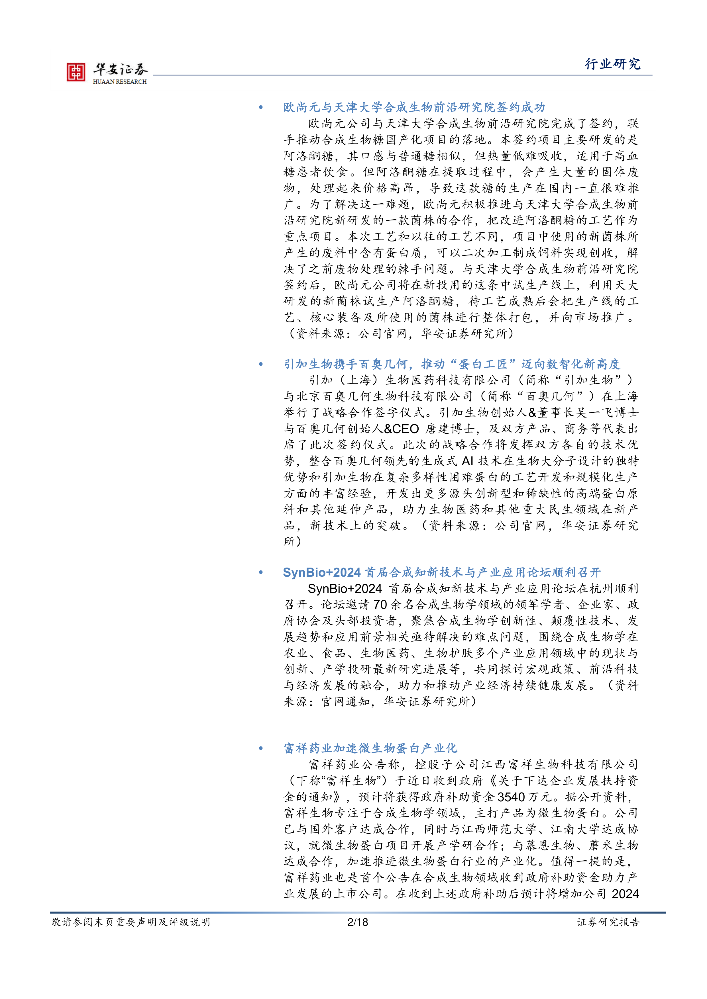 SynBio+2024 首届合成知新技术与产业应用论坛在杭州顺利召开。 论坛邀请 70 余名合成生物学领域的领军学者、企业家、政府协会及头部投资者,聚焦合成生物学创新性、颠覆性技术、发展趋势和应用前景相关亟待解决的难点问题,围绕合成生物学在农业、食品、生物医药、生物护肤多个产业应用领域中的现状与创新、产学投研最新研究进展等,共同探讨宏观政策、前沿科技与经济发展的融合,助力和推动产业经济持续健康发展。 (资料来源:官网通知,华安证券研究所)