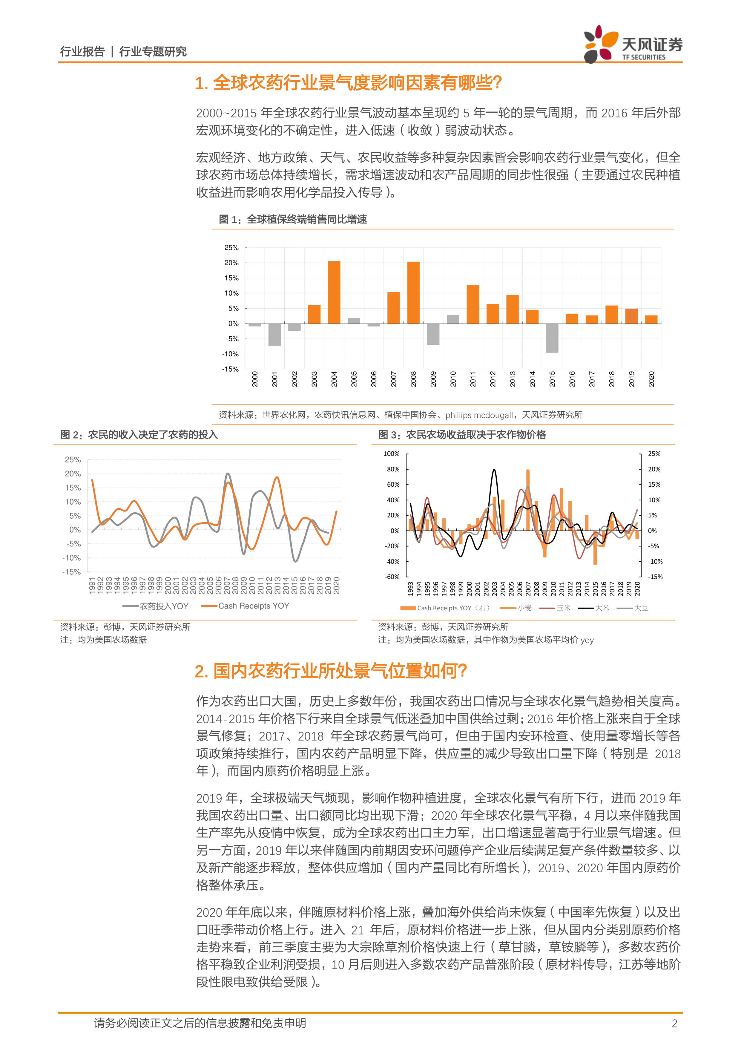 报告首先分析了影响全球农药行业景气度的因素,并通过图表展示了全球植保终端销售同比增速、农民收入与农药投入的关系以及农作物价格对农民农场收益的影响。数据显示,全球农药市场总体持续增长,但需求增速波动与农产品周期同步性强。