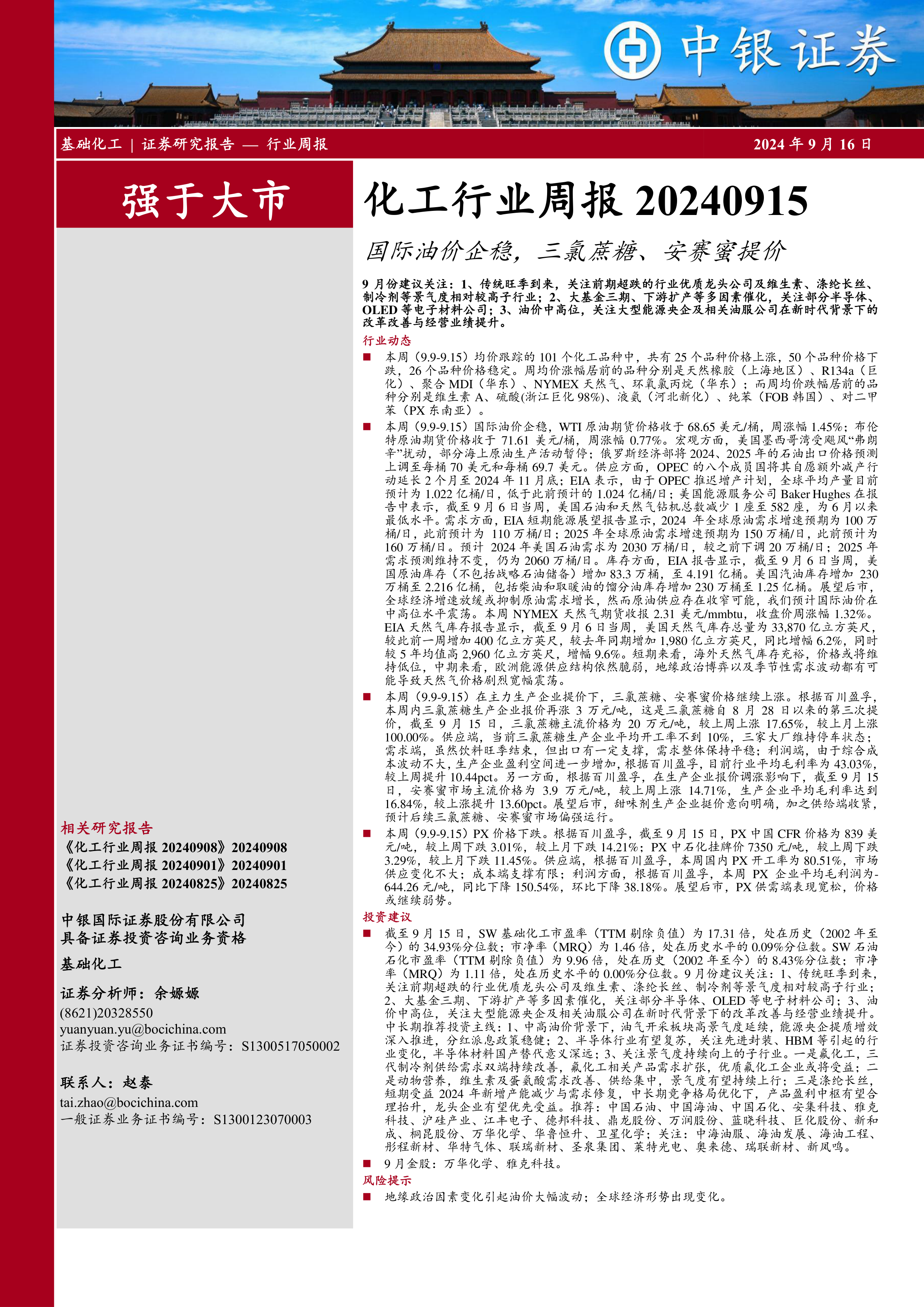 截至9月15日,SW基础化工市盈率(TTM剔除负值)为17.31倍,处在历史(2002年至今)的34.93%分位数;市净率(MRQ)为1.46倍,处在历史水平的0.09%分位数。SW石油石化市盈率(TTM剔除负值)为9.96倍,处在历史(2002年至今)的8.43%分位数;市净率(MRQ)为1.11倍,处在历史水平的0.00%分位数。9月份建议关注:1、传统旺季到来关注前期超跌的行业优质龙头公司及维生素、涤纶长丝、制冷剂等景气度相对较高子行业;2、大基金三期、下游扩产等多因素催化,关注部分半导体、OLED等电子材料公司;3、油价中高位,关注大型能源央企及相关油服公司在新时代背景下的改革改善与经营业绩提升。中长期推荐投资主线:1、中高油价背景下,油气开采板块高景气度延续,能源央企提质增效深入推进,分红派息政策稳健;2、半导体行业有望复苏,关注先进封装、HBM等引起的行业变化,半导体材料国产替代意义深远;3、关注景气度持续向上的子行业。一是氟化工,三代制冷剂供给需求双端持续改善,氟化工相关产品需求扩张,优质氟化工企业或将受益;二是动物营养,维生素及蛋氨酸需求改善、供给集中,景气度有望持续上行;三是涤纶长丝,短期受益2024年新增产能减少与需求修复,中长期竞争格局优化下,产品盈利中枢有望合理抬升,龙头企业有望优先受益。推荐:中国石油、中国海油、中国石化、安集科技、雅克科技、沪硅产业、江丰电子、德邦科技、鼎龙股份、万润股份、蓝晓科技、巨化股份、新和成、桐昆股份、万华化学、华鲁恒升、卫星化学;关注:中海油服、海油发展、海油工程、彤程新材、华特气体、联瑞新材、圣泉集团、莱特光电、奥来德、瑞联新材、新凤鸣。