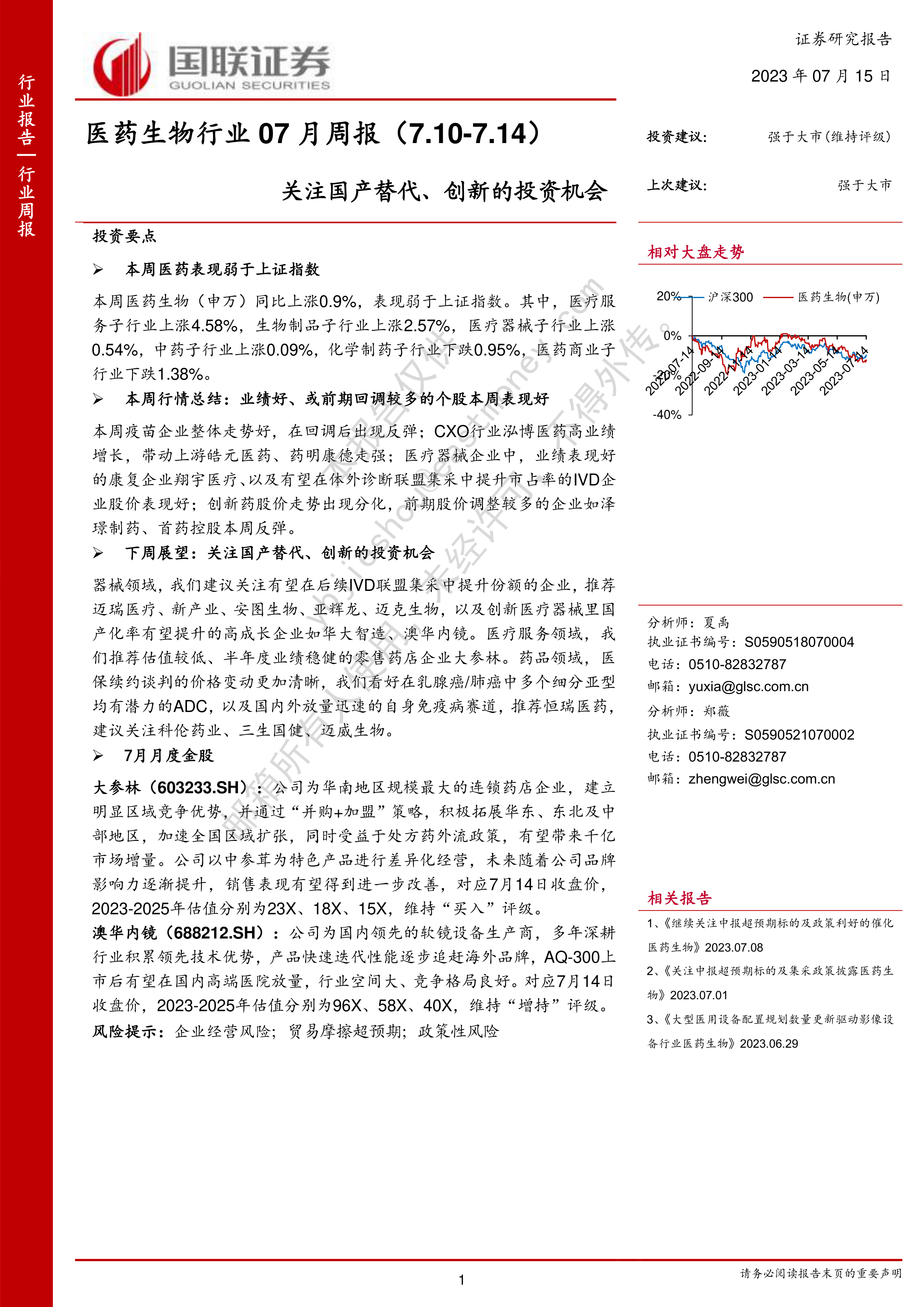 大参林( 603233.SH): 公司为华南地区规模最大的连锁药店企业,建立明显区域竞争优势,并通过“并购+加盟”策略,积极拓展华东、东北及中部地区,加速全国区域扩张,同时受益于处方药外流政策,有望带来千亿市场增量。公司以中参茸为特色产品进行差异化经营,未来随着公司品牌影响力逐渐提升,销售表现有望得到进一步改善,对应7月14日收盘价,2023-2025年估值分别为23X、 18X、 15X,维持“买入”评级。