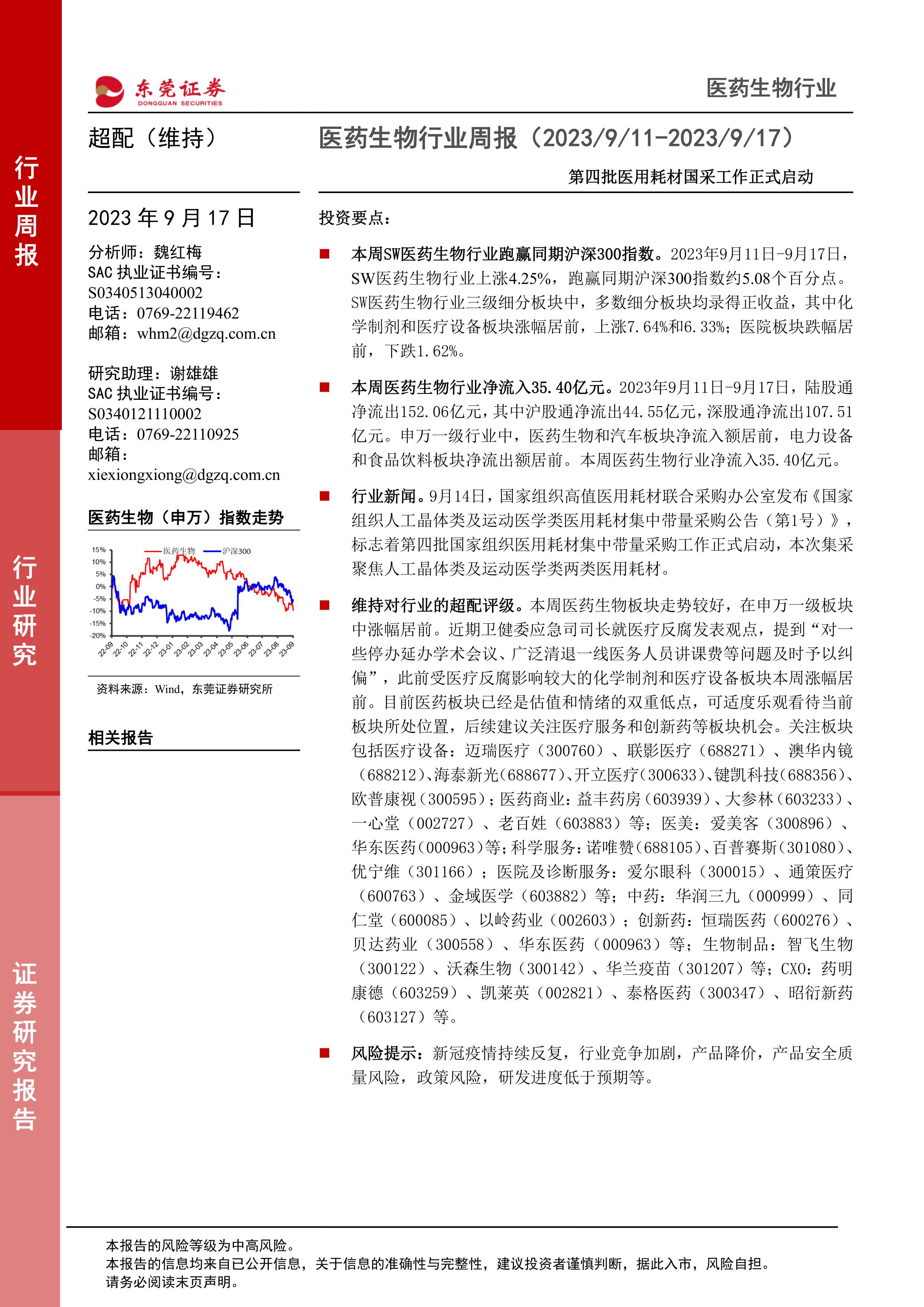 本报告对2023年9月11日至17日申万医药生物行业进行了周度回顾和分析。数据显示,本周医药生物行业整体表现强劲,跑赢大盘,多数细分板块和个股录得正收益,行业估值处于低位。国家启动第四批医用耗材集采以及多家上市公司发布积极公告,也为行业发展注入动力。然而,报告也指出了行业面临的诸多风险,包括疫情反复、政策风险、研发风险等。因此,报告建议投资者谨慎乐观,关注医疗服务和创新药等板块机会,并对部分具有投资价值的上市公司进行了推荐。 投资者需根据自身风险承受能力进行投资决策,并自行承担投资风险。