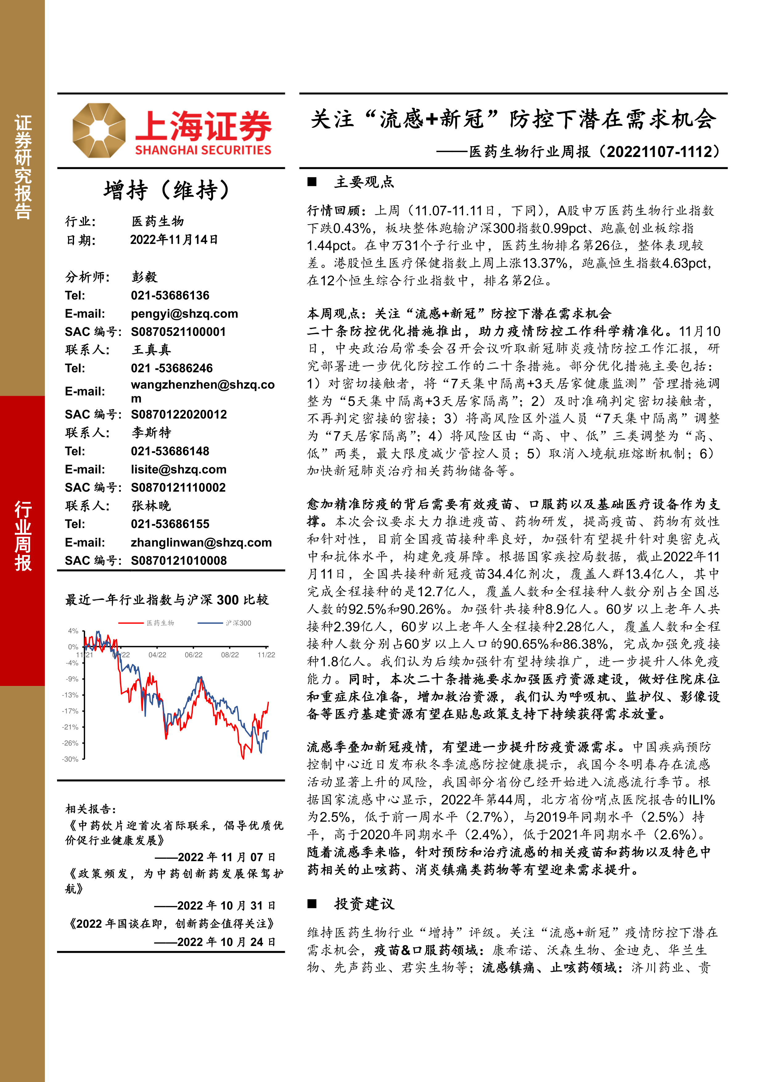 报告建议增持医药生物行业,并重点关注疫苗与口服药、流感镇痛止咳药以及医疗新基建领域的相关公司。