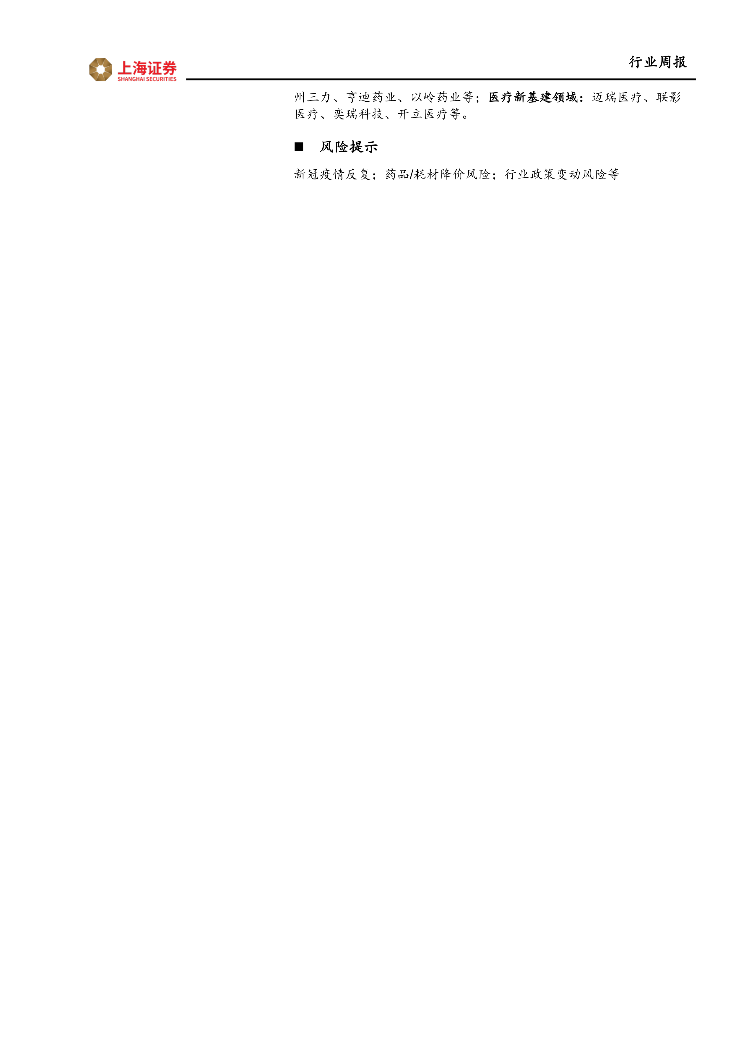 本报告通过对一周市场行情、行业新闻和疫情数据的分析,指出在“二十条”优化疫情防控措施和流感季叠加的背景下,医药生物行业面临新的市场机遇。 报告建议投资者关注精准防疫下的需求增长、流感季叠加效应带来的市场机会,并重点关注疫苗与口服药、流感镇痛止咳药以及医疗新基建领域的相关公司。 然而,投资者也需关注新冠疫情反复、药品/耗材降价以及行业政策变动等风险。
