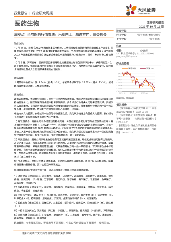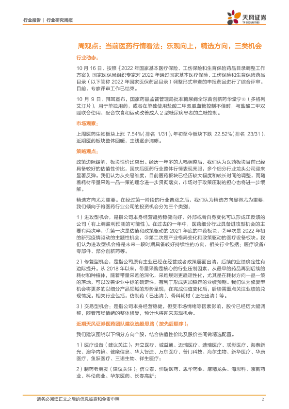 医药生物行业研究周报:周观点:当前医药行情看法:乐观向上,精选方向,三类机会