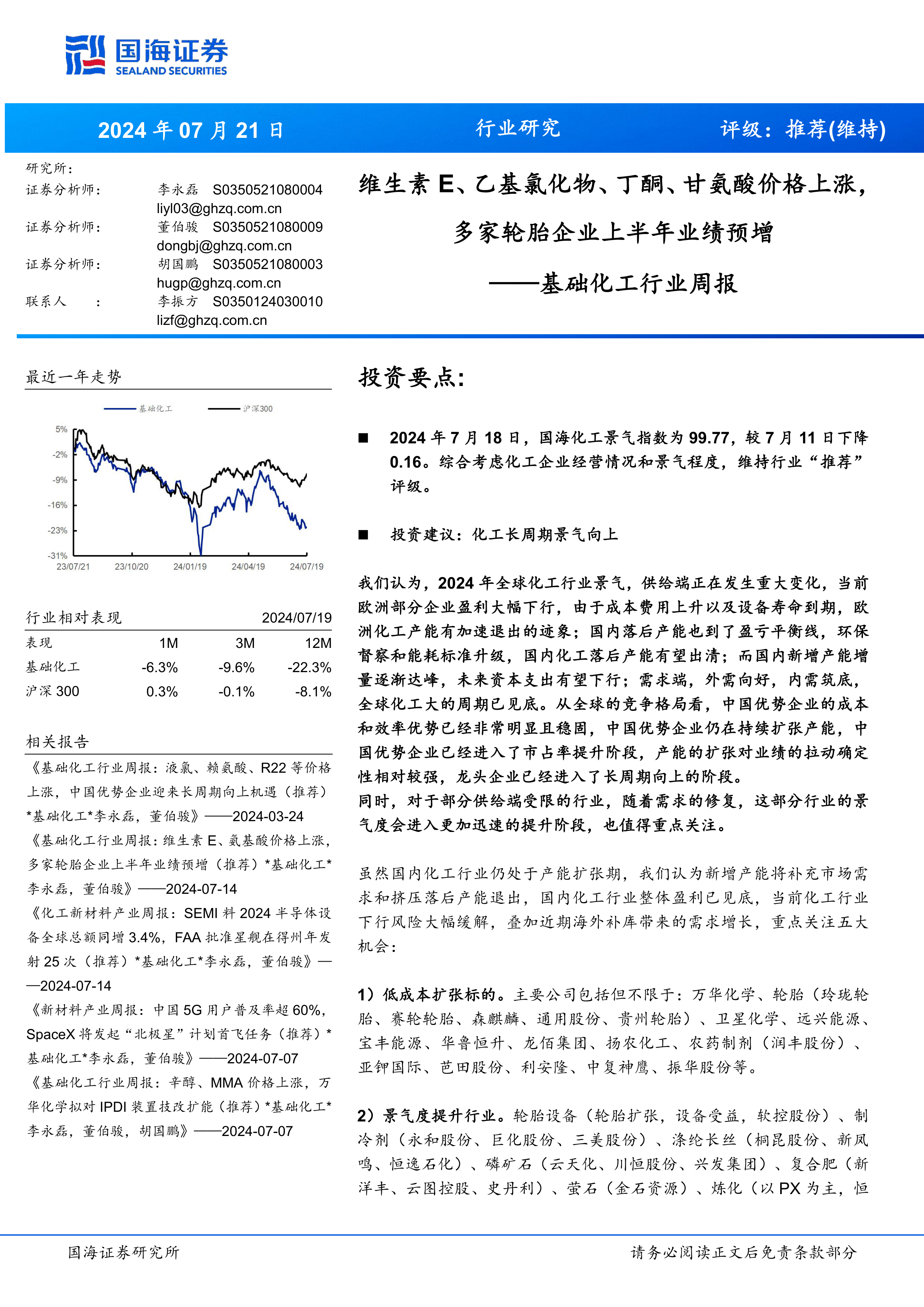 报告指出,2024年7月18日,国海化工景气指数为99.77,较7月11日下降0.16。但综合考虑化工企业经营情况和景气程度,报告维持基础化工行业“推荐”评级。 报告还提供了基础化工行业、沪深300指数在1个月、3个月和12个月内的涨跌幅数据,显示基础化工行业跑输沪深300指数。