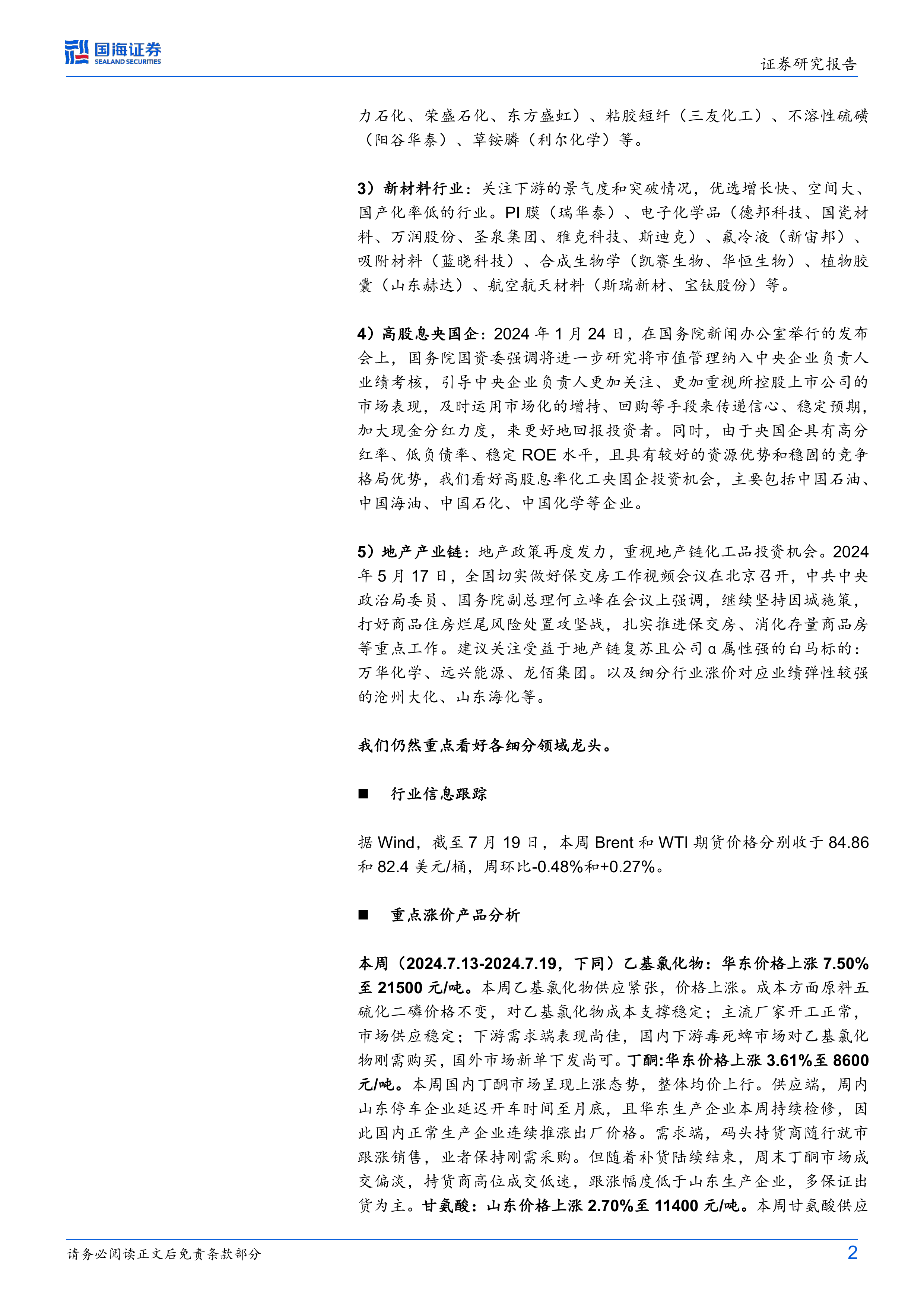 本周(2024.7.13-2024.7.19,下同)乙基氯化物:华东价格上涨7.50%至21500元/吨。本周乙基氯化物供应紧张,价格上涨。成本方面原料五硫化二磷价格不变,对乙基氯化物成本支撑稳定;主流厂家开工正常,市场供应稳定;下游需求端表现尚佳,国内下游毒死蜱市场对乙基氯化物刚需购买,国外市场新单下发尚可。丁酮:华东价格上涨3.61%至8600元/吨。本周国内丁酮市场呈现上涨态势,整体均价上行。供应端,周内山东停车企业延迟开车时间至月底,且华东生产企业本周持续检修,因此国内正常生产企业连续推涨出厂价格。需求端,码头持货商随行就市跟涨销售,业者保持刚需采购。但随着补货陆续结束,周末丁酮市场成交偏淡,持货商高位成交低迷,跟涨幅度低于山东生产企业,多保证出货为主。甘氨酸:山东价格上涨2.70%至11400元/吨。本周甘氨酸供应端维持挺价态度,价格窄幅上涨。从成本看,上游山东、河北地区液氯、醋酸价格上涨,甘氨酸生产成本增加,供应端多持挺价态度,不愿让利出货。山东某主流工厂维持检修状态,河北某检修企业恢复降负荷开工,甘氨酸现货供应一般。需求端表现弱稳,主要下游草甘膦行情不佳,但甘氨酸市场低价货源难寻,新单成交价格窄幅上涨;下游食品、医药行业需求稳好,拿货积极。