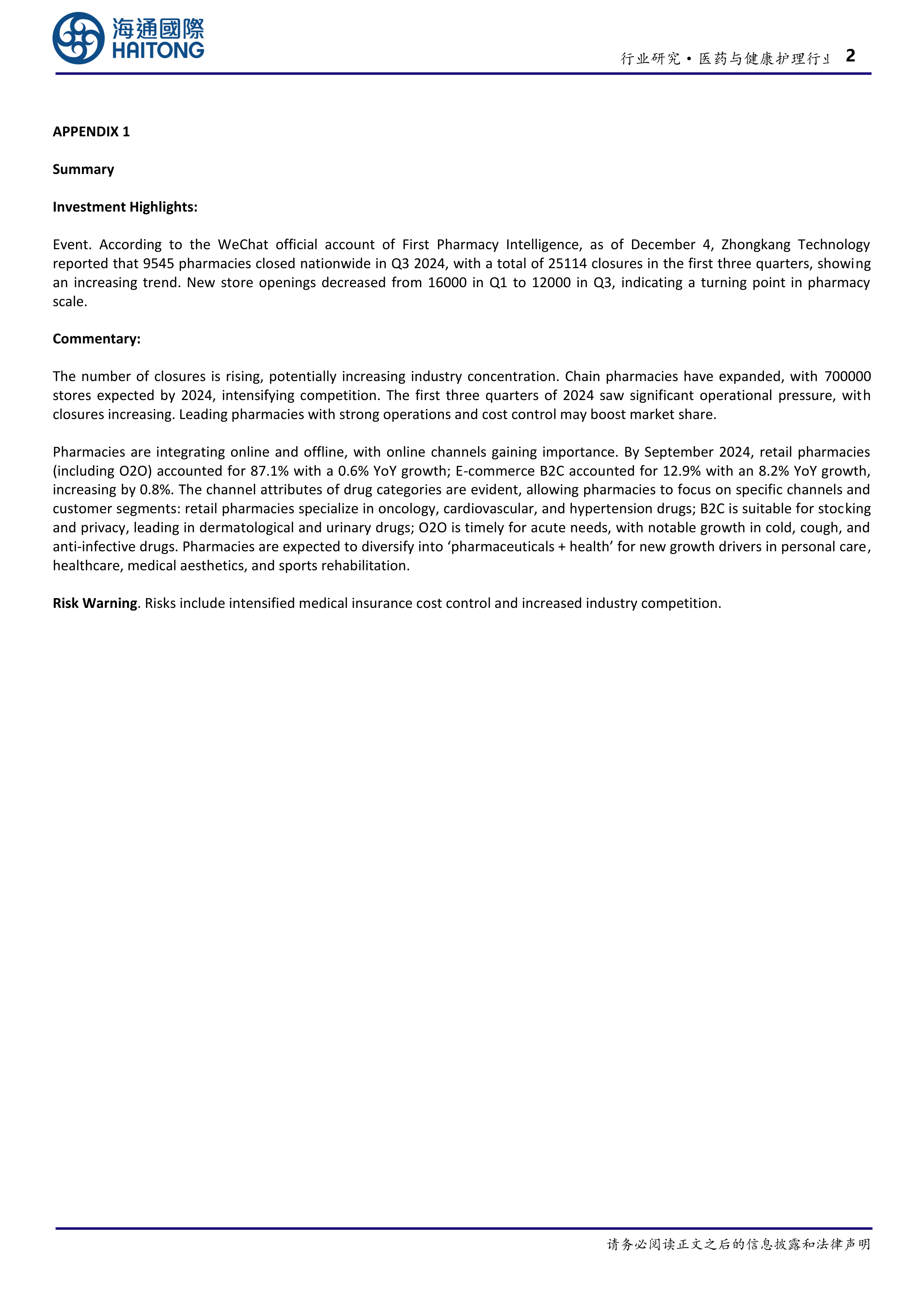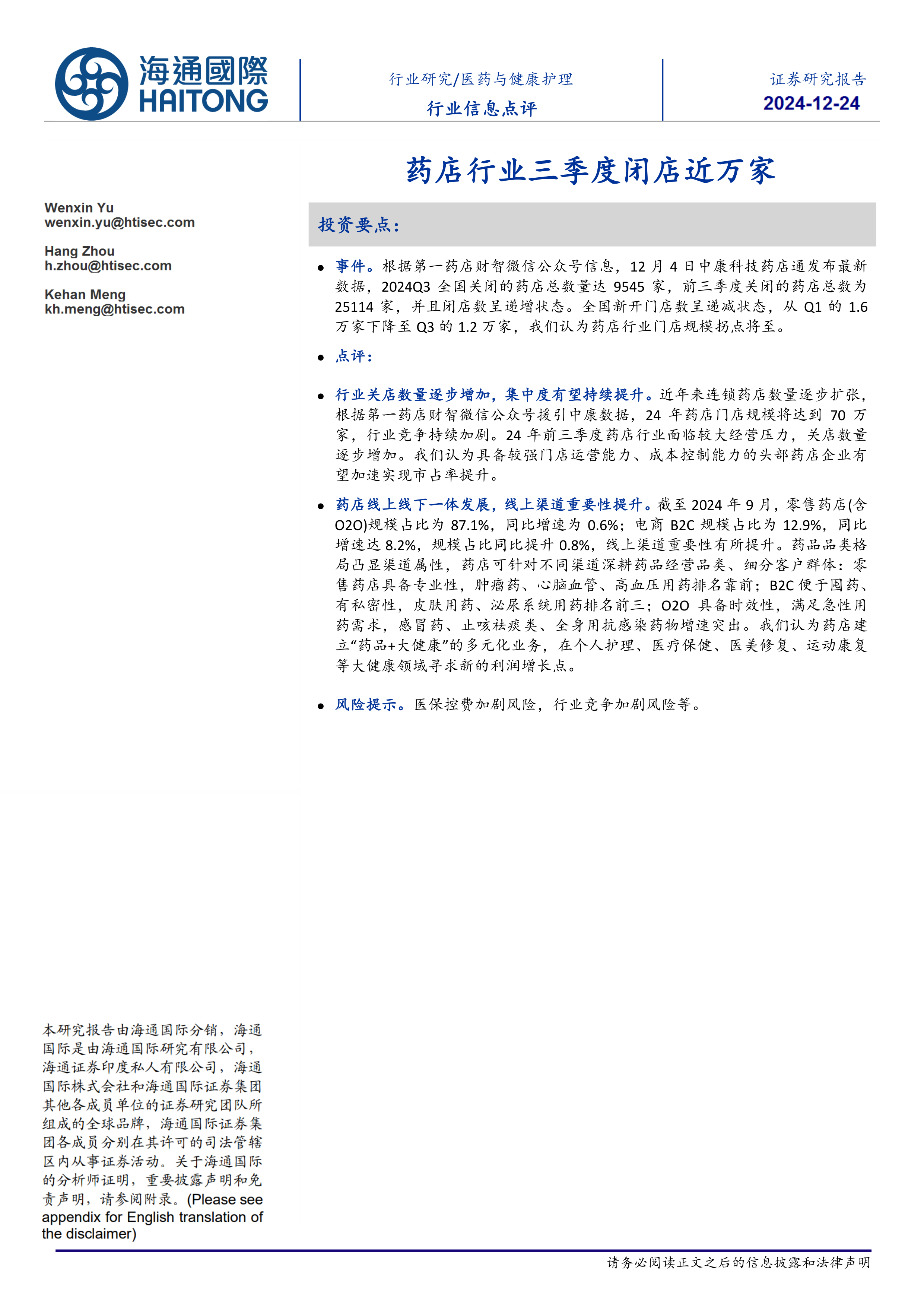 事件。根据第一药店财智微信公众号信息,12月4日中康科技药店通发布最新数据,2024Q3全国关闭的药店总数量达9545家,前三季度关闭的药店总数为25114家,并且闭店数呈递增状态。全国新开门店数呈递减状态,从Q1的1.6万家下降至Q3的1.2万家,我们认为药店行业门店规模拐点将至。