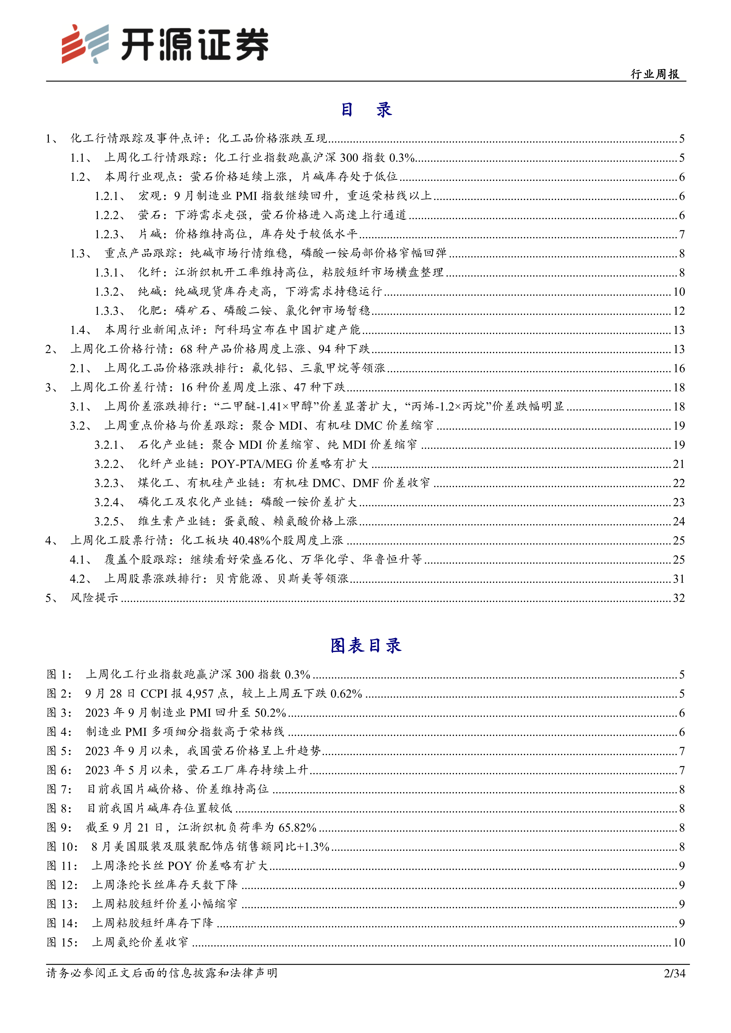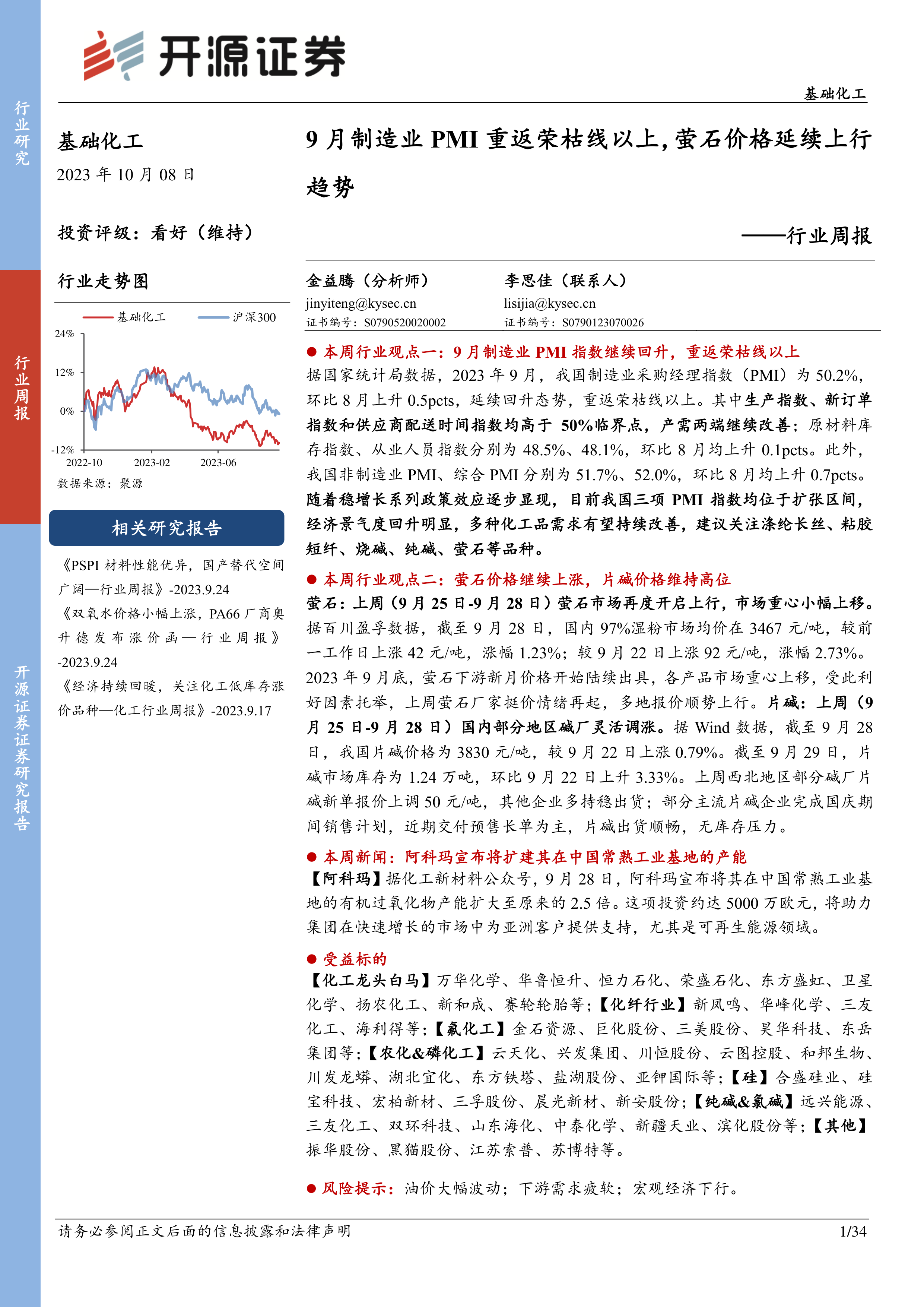 基础化工行业周报:9月制造业PMI重返荣枯线以上,萤石价格延续上行趋势
