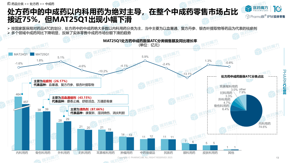 处方药中的中成药以内科用药为主,占比接近75%,但MAT25Q1出现小幅下滑。多个领域的中成药同比下降明显,反映了实体零售中成药市场份额下滑的趋势。