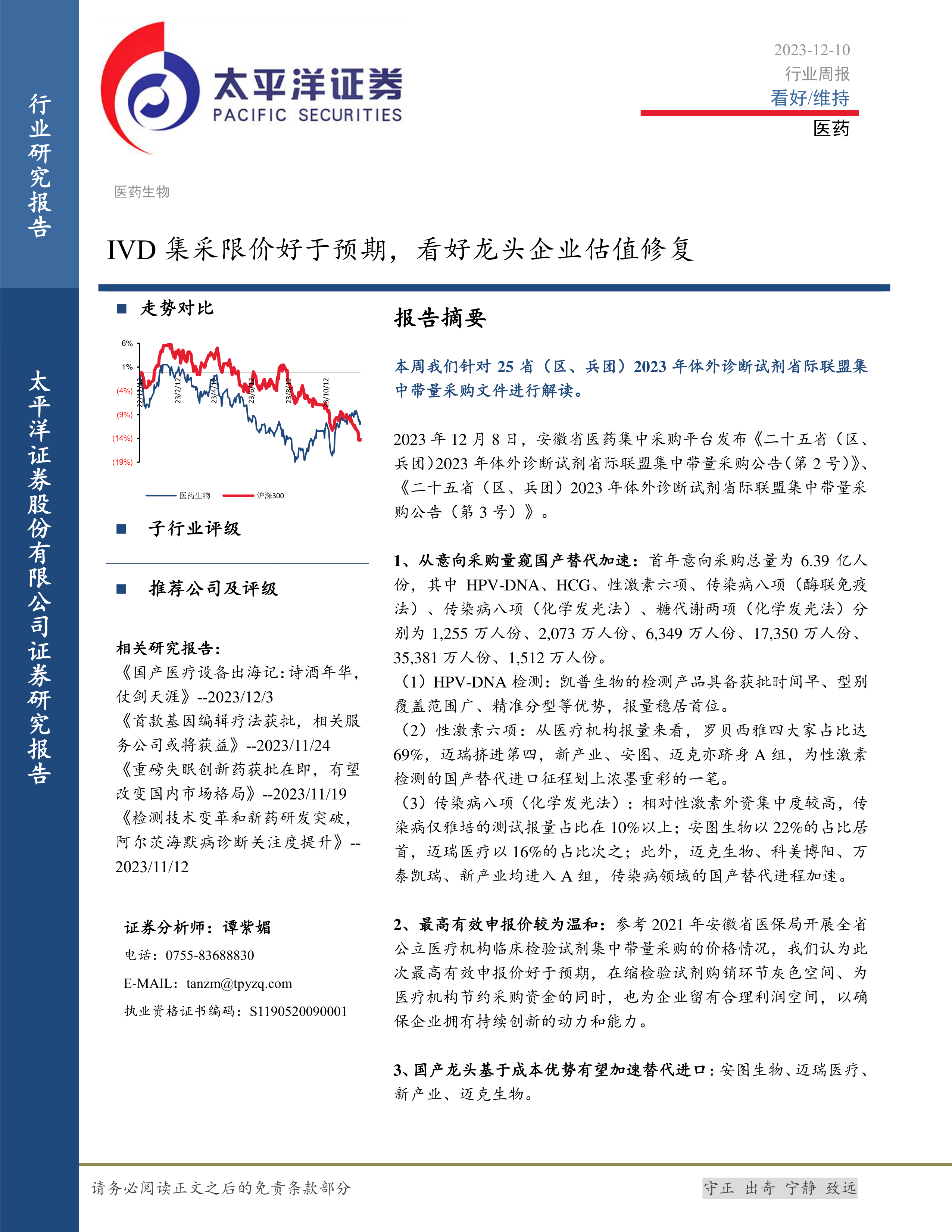 医药行业周报:IVD集采限价好于预期,看好龙头企业估值修复