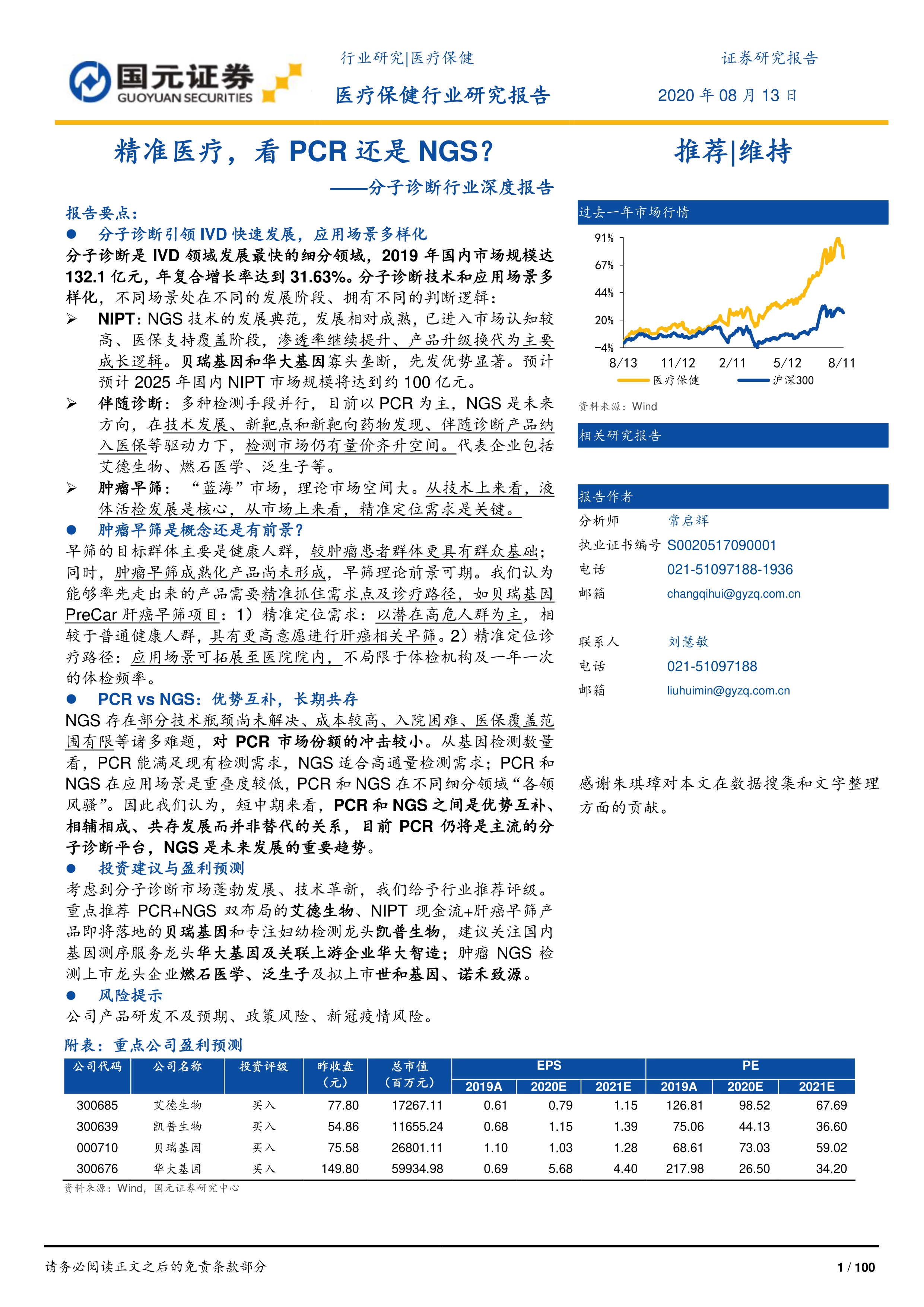 考虑到分子诊断市场蓬勃发展、技术革新,我们给予行业推荐评级。重点推荐PCR+NGS双布局的艾德生物、NIPT现金流+肝癌早筛产品即将落地的贝瑞基因和专注妇幼检测龙头凯普生物,建议关注国内基因测序服务龙头华大基因及关联上游企业华大智造;肿瘤NGS检测上市龙头企业燃石医学、泛生子及拟上市世和基因、诺禾致源。