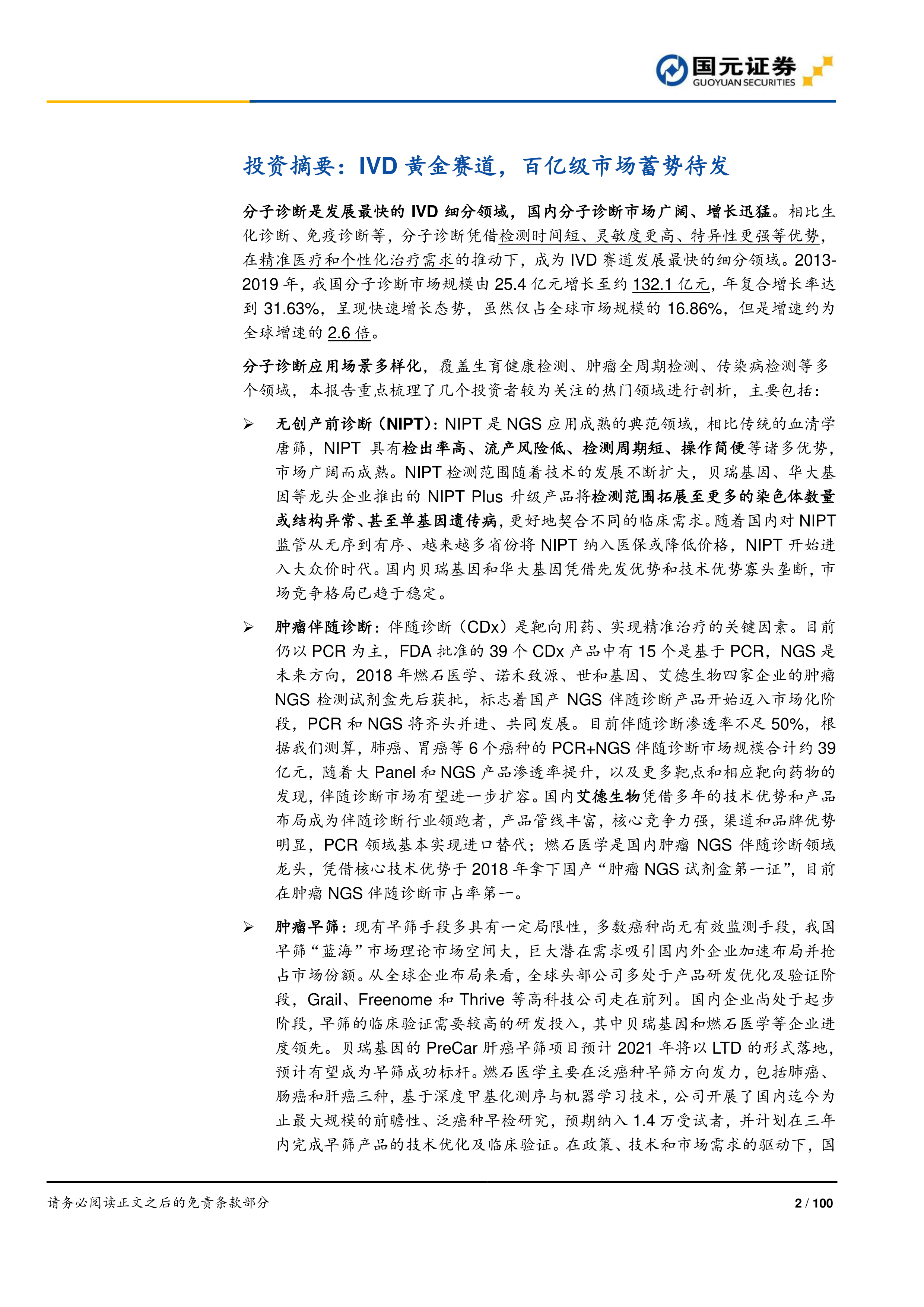 本报告的核心观点是:分子诊断技术引领IVD行业快速发展,PCR和NGS技术优势互补,长期共存。市场空间巨大,尤其在无创产前诊断(NIPT)、肿瘤伴随诊断、肿瘤早筛和传染病检测等领域。 报告重点推荐PCR+NGS双布局的艾德生物、NIPT龙头贝瑞基因和妇幼检测龙头凯普生物,并建议关注基因测序龙头华大基因及其关联企业华大智造,以及肿瘤NGS检测龙头燃石医学和泛生子等。
