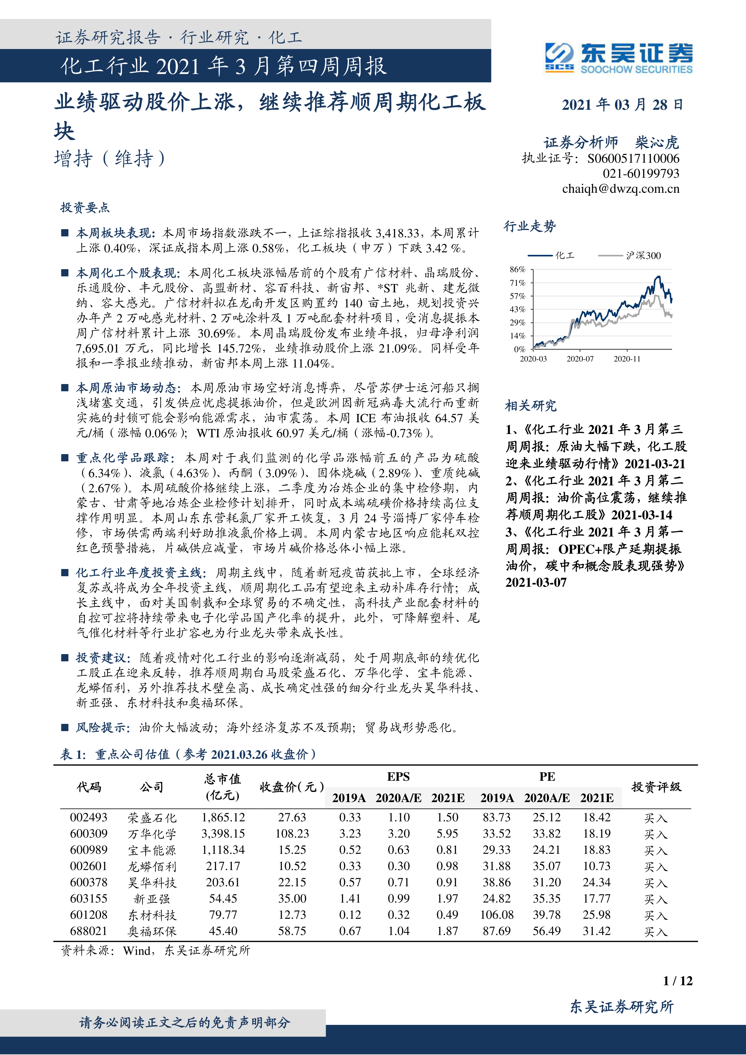 化工行业2021年3月第四周周报:业绩驱动股价上涨,继续推荐顺周期化工板块
