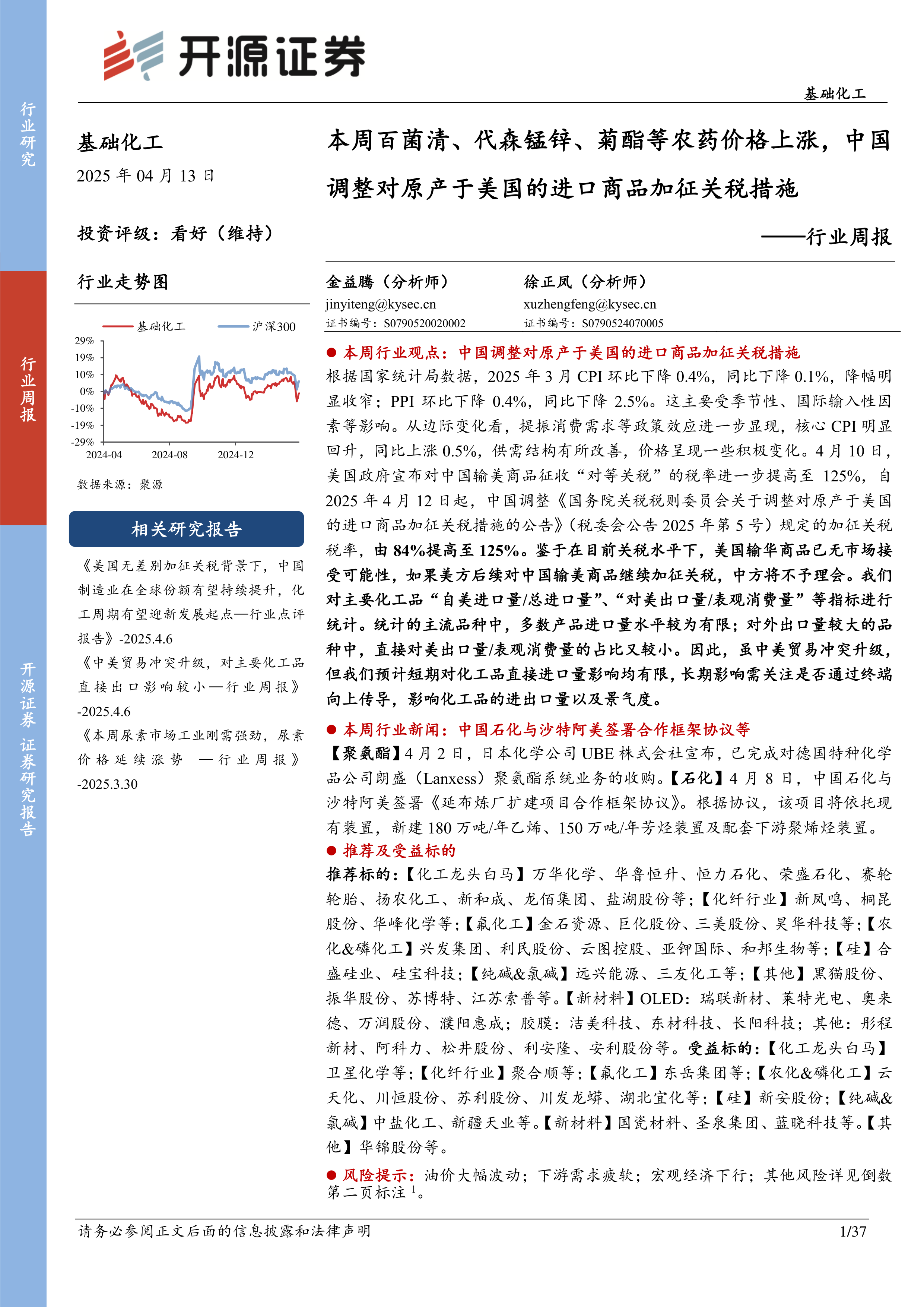 本报告的核心观点是:尽管中美贸易冲突升级,短期内对中国化工品直接进口量影响有限,但长期影响仍需关注。2025年3月CPI同比降幅收窄,核心CPI回升,显示出积极的经济信号;PPI继续下降,但部分行业价格呈现积极变化。农药价格上涨,部分化工品价格涨跌互现,化工板块个股涨跌分化。建议关注化工龙头企业及受益于行业景气度提升的标的。