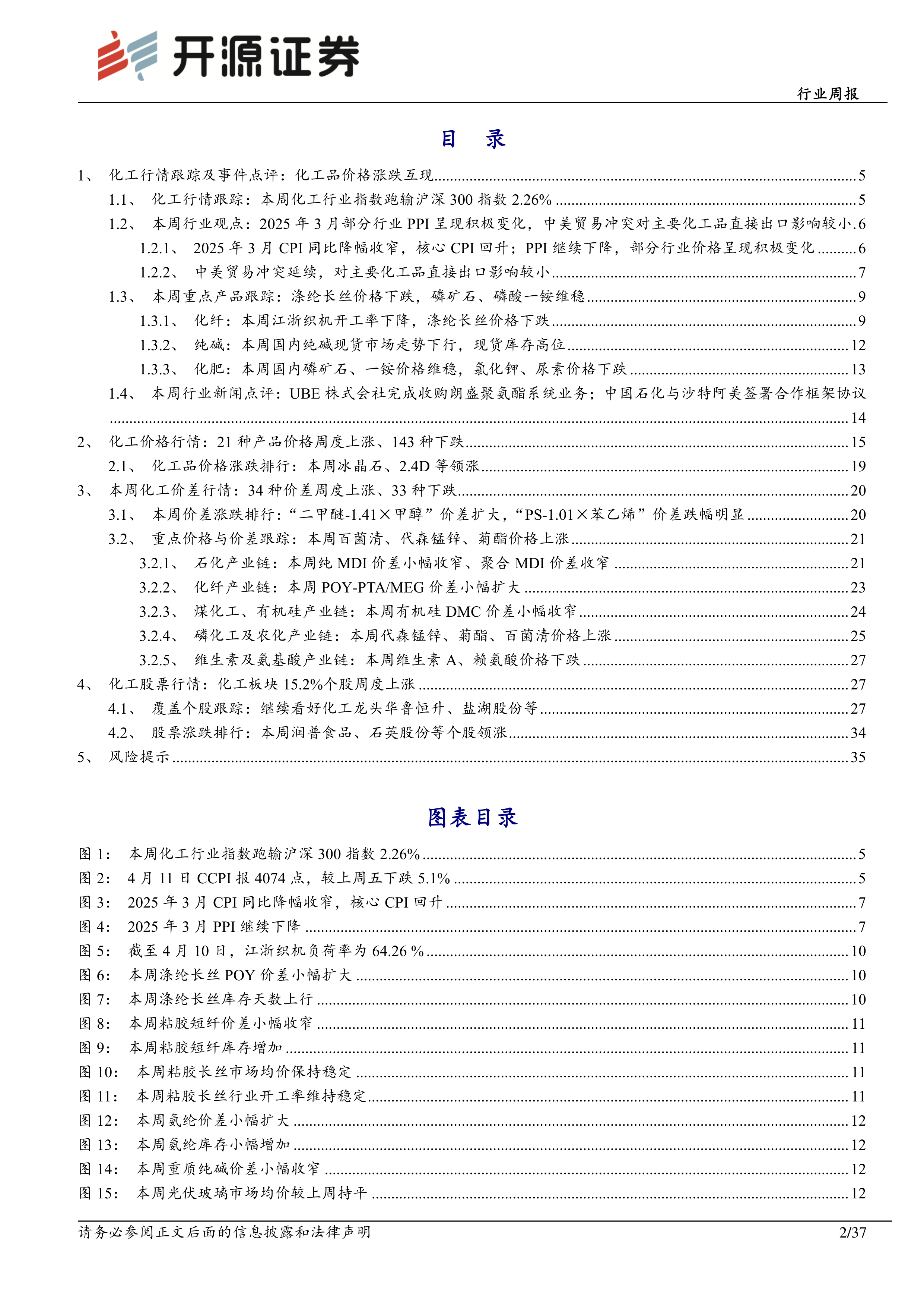 本报告对2025年4月13日当周的化工行业进行了全面分析,涵盖了宏观经济形势、中美贸易冲突、化工品价格走势、化工价差、化工股票行情等多个方面。报告指出,尽管中美贸易冲突升级,但短期内对中国化工品直接进口量影响有限,长期影响仍需关注。宏观经济数据显示积极信号,部分化工品价格上涨,但整体市场涨跌互现。建议投资者关注化工龙头企业及受益于行业景气度提升的标的,同时需注意投资风险。 报告中提供了多张图表和表格,对数据进行了详细的呈现和分析,为投资者提供了有价值的参考信息。