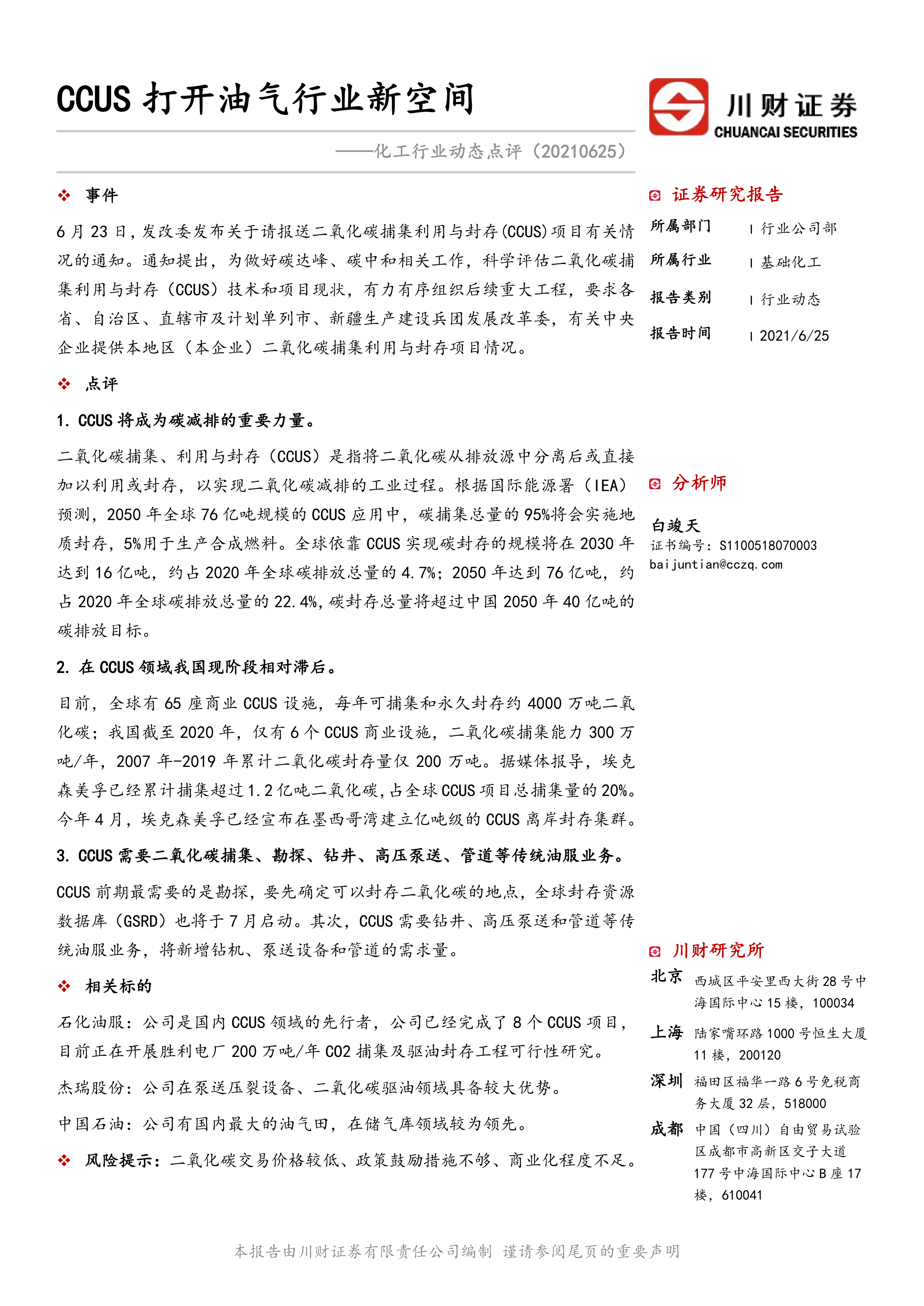 化工行业动态点评:CCUS打开油气行业新空间
