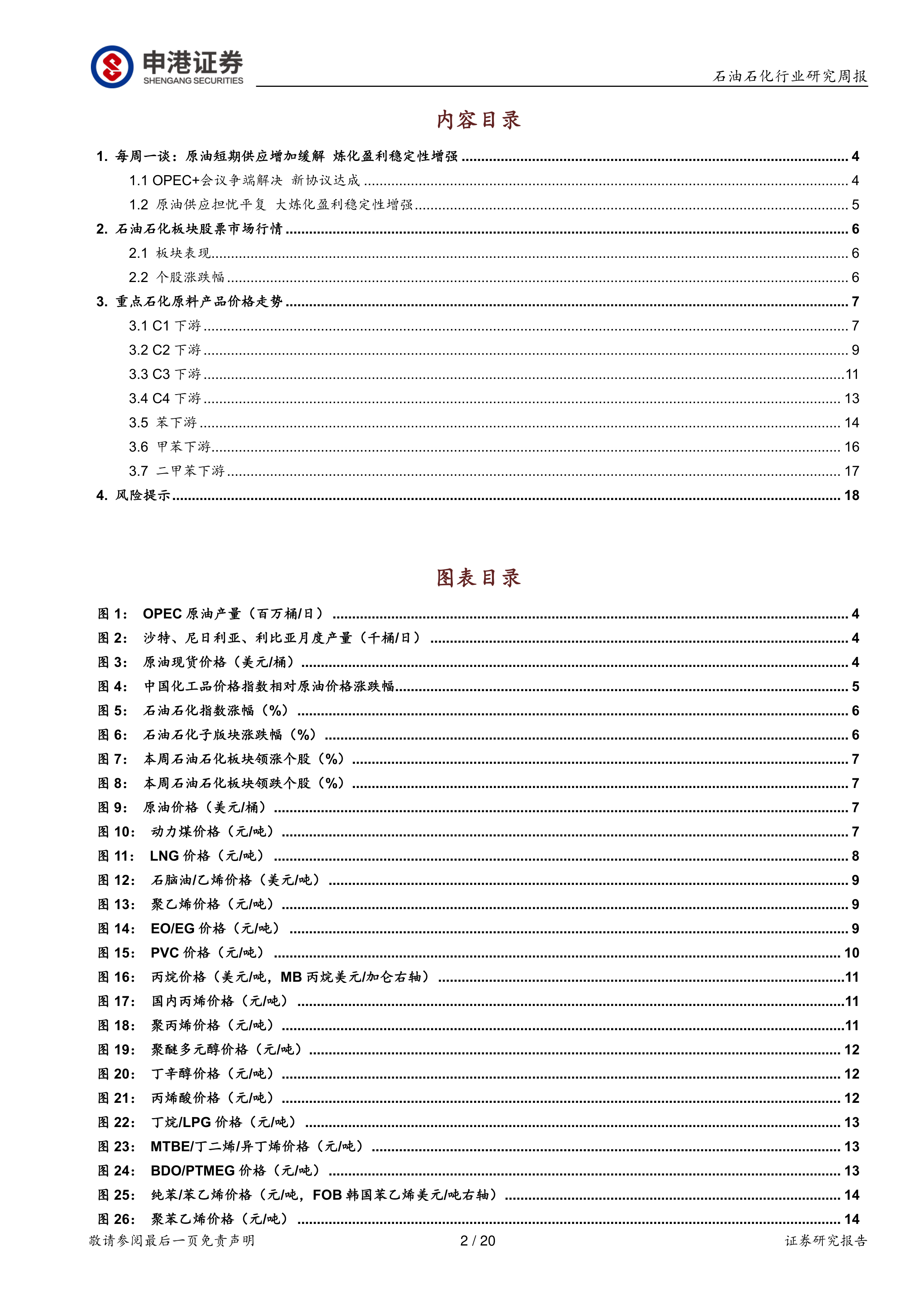 本报告基于OPEC+新协议达成以及国内炼化行业发展现状,分析了石油石化行业短期内的市场走势。 OPEC+协议缓解了市场对短期原油供应增加的担忧,而国内新建大炼化装置的投产和技术升级则增强了大型炼化企业的盈利稳定性。 报告认为,在原油价格上涨和下游需求强劲的背景下,大型炼化企业将受益于炼油毛利和化工品价差的扩张,未来业绩增长确定性强,看好大炼化板块行情持续向好。 然而,投资者仍需关注政策风险、地缘政治风险以及原油价格剧烈波动等风险因素。