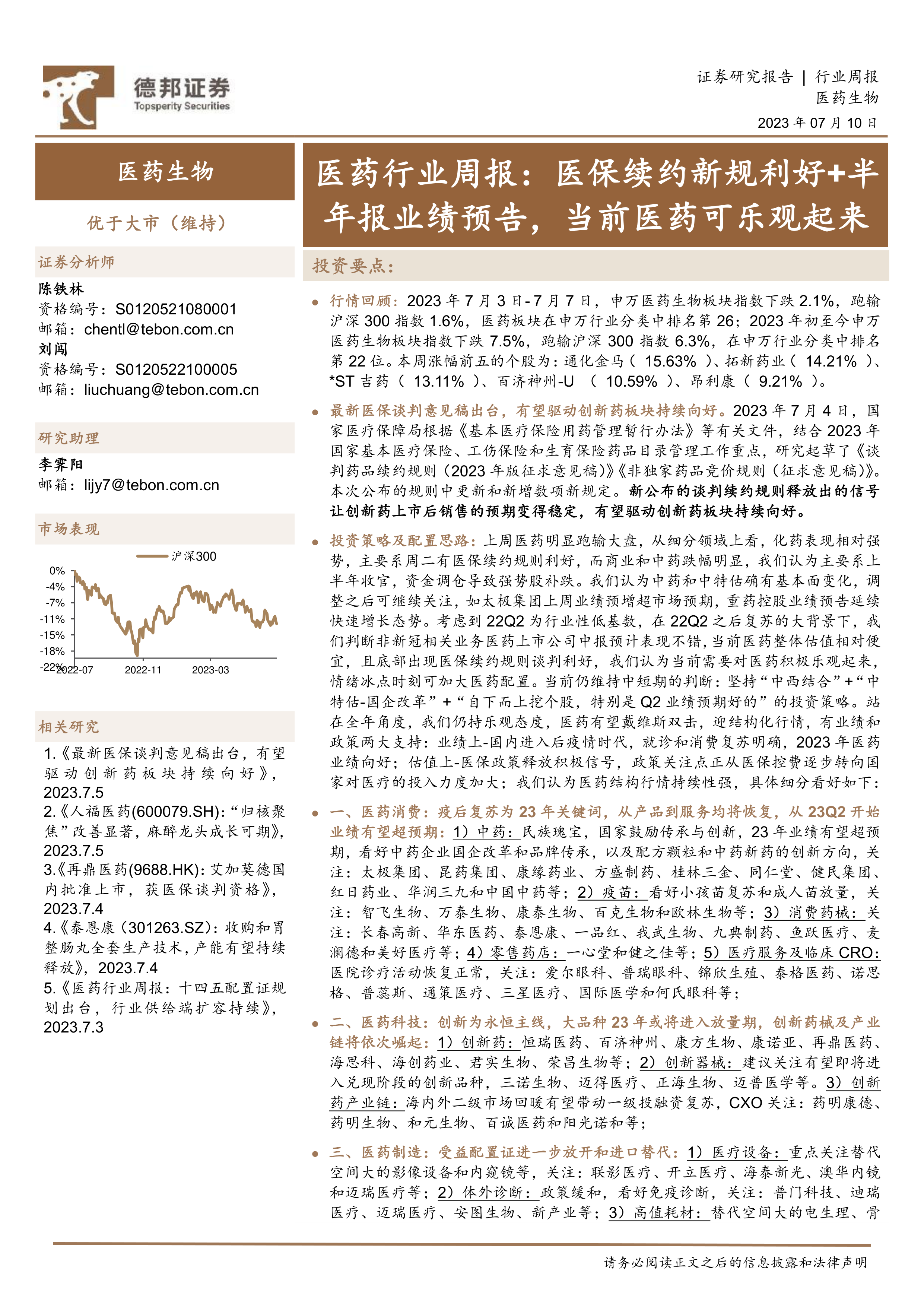 投资策略及配置思路:上周医药明显跑输大盘,从细分领域上看,化药表现相对强势,主要系周二有医保续约规则利好,而商业和中药跌幅明显,我们认为主要系上半年收官,资金调仓导致强势股补跌。我们认为中药和中特估确有基本面变化,调整之后可继续关注,如太极集团上周业绩预增超市场预期,重药控股业绩预告延续快速增长态势。考虑到22Q2为行业性低基数,在22Q2之后复苏的大背景下,我们判断非新冠相关业务医药上市公司中报预计表现不错,当前医药整体估值相对便宜,且底部出现医保续约规则谈判利好,我们认为当前需要对医药积极乐观起来,情绪冰点时刻可加大医药配置。当前仍维持中短期的判断:坚持“中西结合”+“中特估-国企改革”+“自下而上挖个股,特别是Q2业绩预期好的”的投资策略。站在全年角度,我们仍持乐观态度,医药有望戴维斯双击,迎结构化行情,有业绩和政策两大支持:业绩上-国内进入后疫情时代,就诊和消费复苏明确,2023年医药业绩向好;估值上-医保政策释放积极信号,政策关注点正从医保控费逐步转向国家对医疗的投入力度加大;我们认为医药结构行情持续性强,具体细分看好如下:
