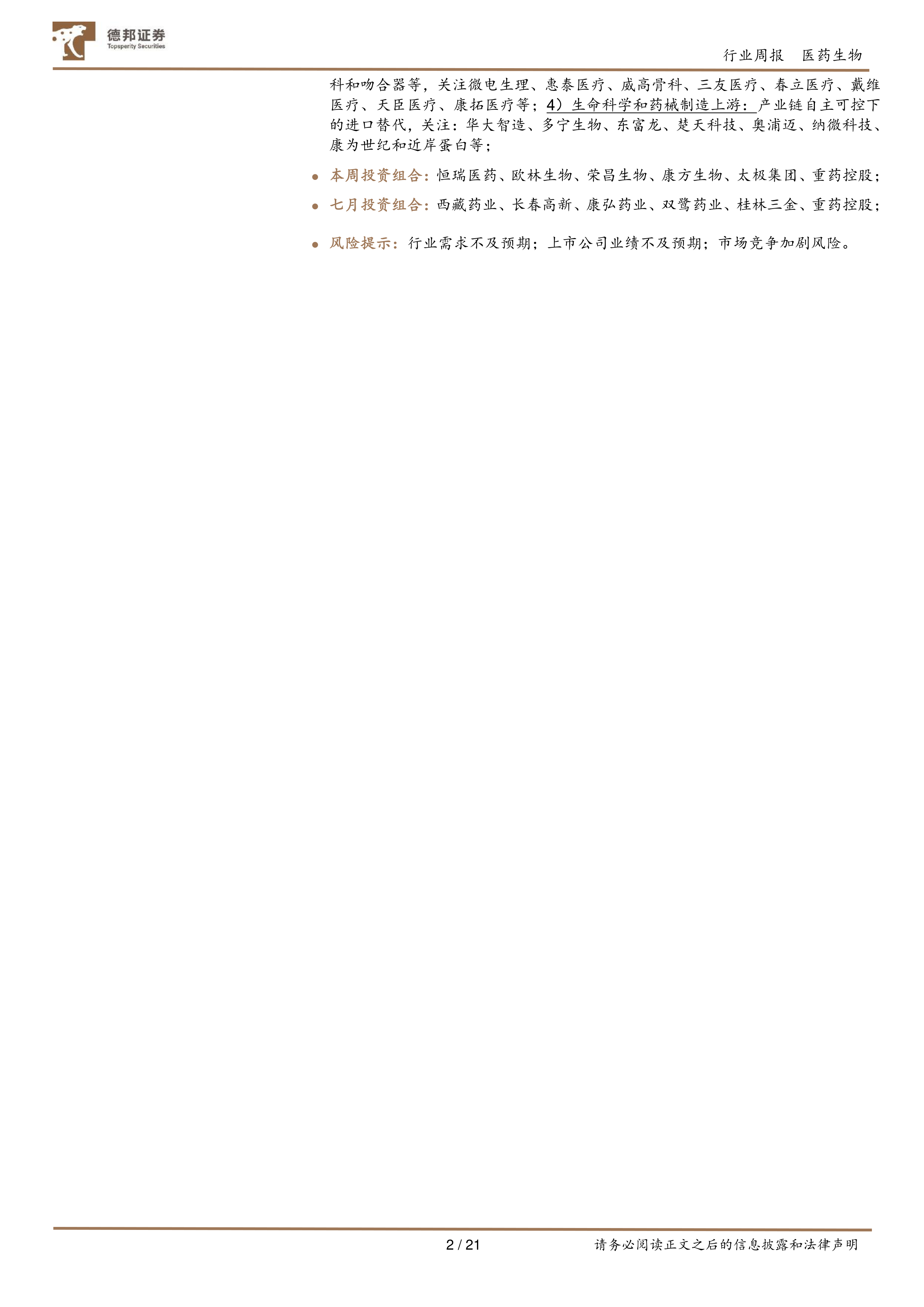 本报告基于对市场行情的分析和对医保续约新规的解读,认为当前医药行业值得乐观。医保政策的积极信号以及医药公司中报业绩的向好预期,为医药板块的投资提供了良好的机会。报告建议投资者关注并积极配置医药板块,并对医药消费、医药科技、医药制造等细分领域提出了具体的投资建议。 然而,投资者仍需关注行业需求不及预期、上市公司业绩不及预期以及市场竞争加剧等风险。