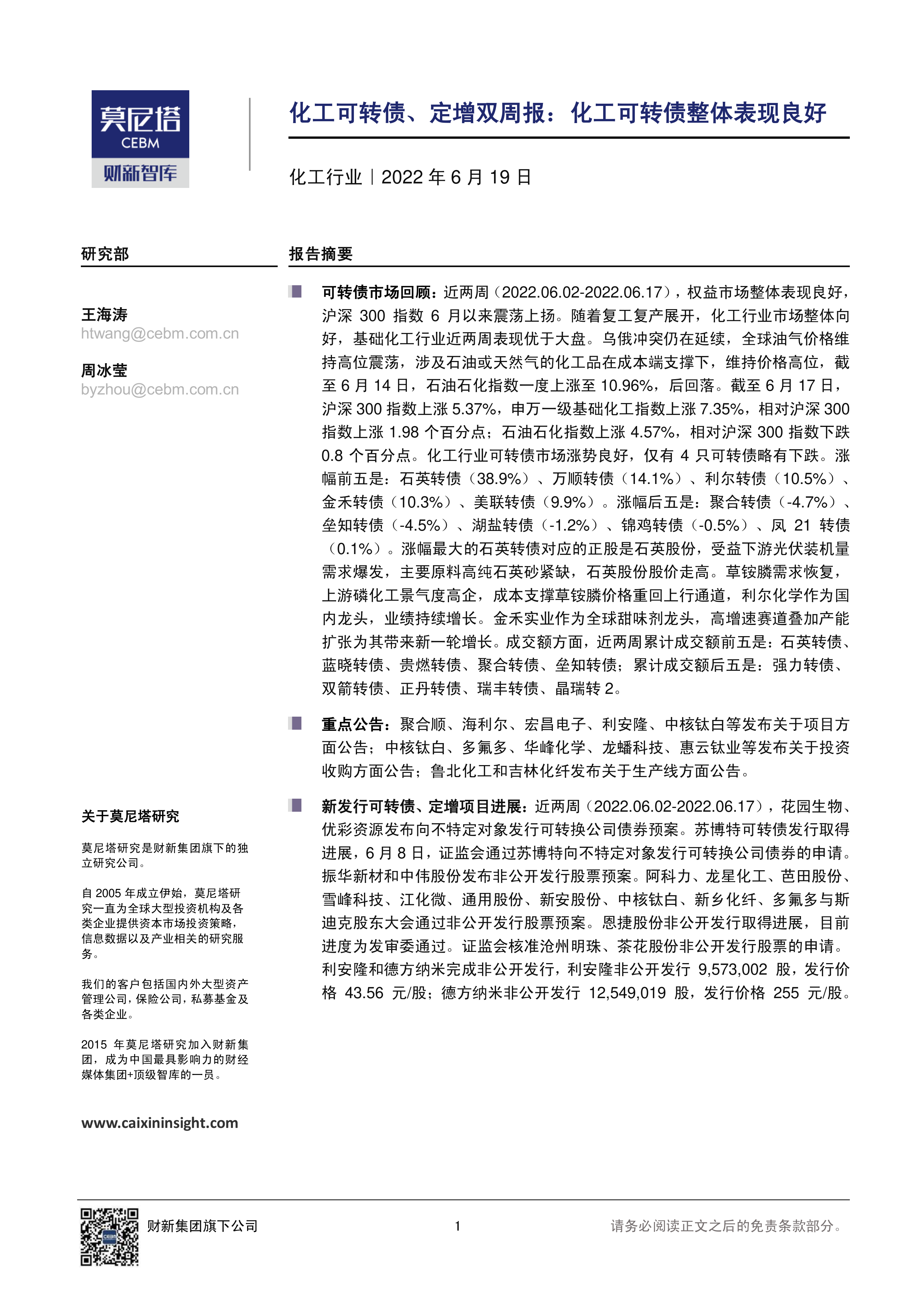 本报告对2022年6月2日至17日期间化工可转债市场和定增市场进行了数据分析,并对化工行业的重要新闻和事件进行了梳理。报告显示,化工可转债市场整体表现良好,部分可转债涨幅显著,这与宏观经济环境、行业景气度以及部分公司自身业绩增长密切相关。同时,报告跟踪了多家化工企业的新发行可转债和定增项目进展,为投资者提供了市场动态和投资参考。 然而,报告也指出,全球能源市场波动和地缘政治风险依然存在,对化工行业未来发展存在不确定性。投资者需密切关注市场变化,谨慎决策。