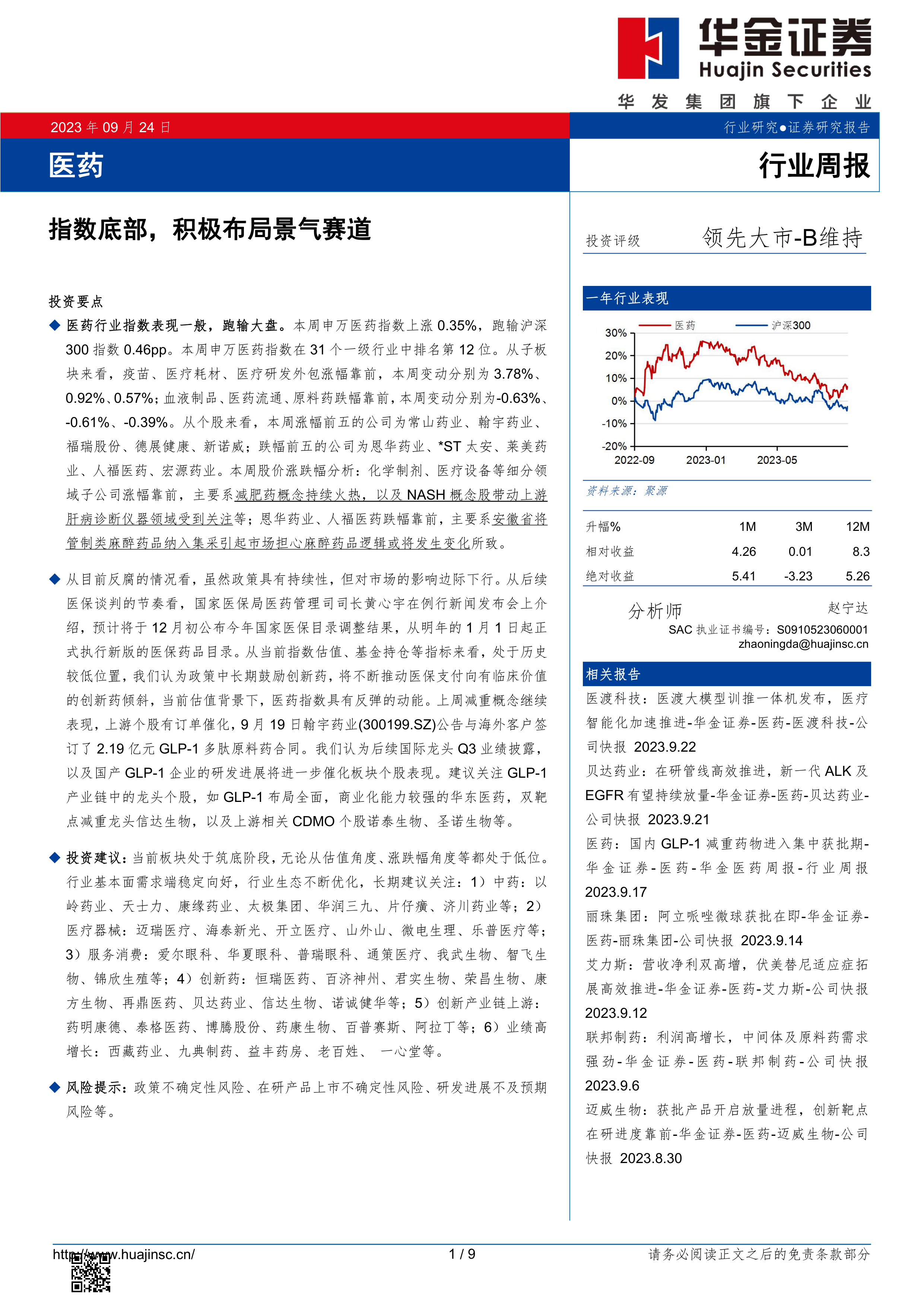 从目前反腐的情况看, 虽然政策具有持续性, 但对市场的影响边际下行。 从后续医保谈判的节奏看, 国家医保局医药管理司司长黄心宇在例行新闻发布会上介绍, 预计将于 12 月初公布今年国家医保目录调整结果, 从明年的 1 月 1 日起正式执行新版的医保药品目录。 从当前指数估值、 基金持仓等指标来看, 处于历史较低位置, 我们认为政策中长期鼓励创新药, 将不断推动医保支付向有临床价值的创新药倾斜, 当前估值背景下, 医药指数具有反弹的动能。 上周减重概念继续表现, 上游个股有订单催化, 9 月 19 日翰宇药业(300199.SZ)公告与海外客户签订了 2.19 亿元 GLP-1 多肽原料药合同。 我们认为后续国际龙头 Q3 业绩披露,以及国产 GLP-1 企业的研发进展将进一步催化板块个股表现。 建议关注 GLP-1产业链中的龙头个股, 如 GLP-1 布局全面, 商业化能力较强的华东医药, 双靶点减重龙头信达生物, 以及上游相关 CDMO 个股诺泰生物、 圣诺生物等。