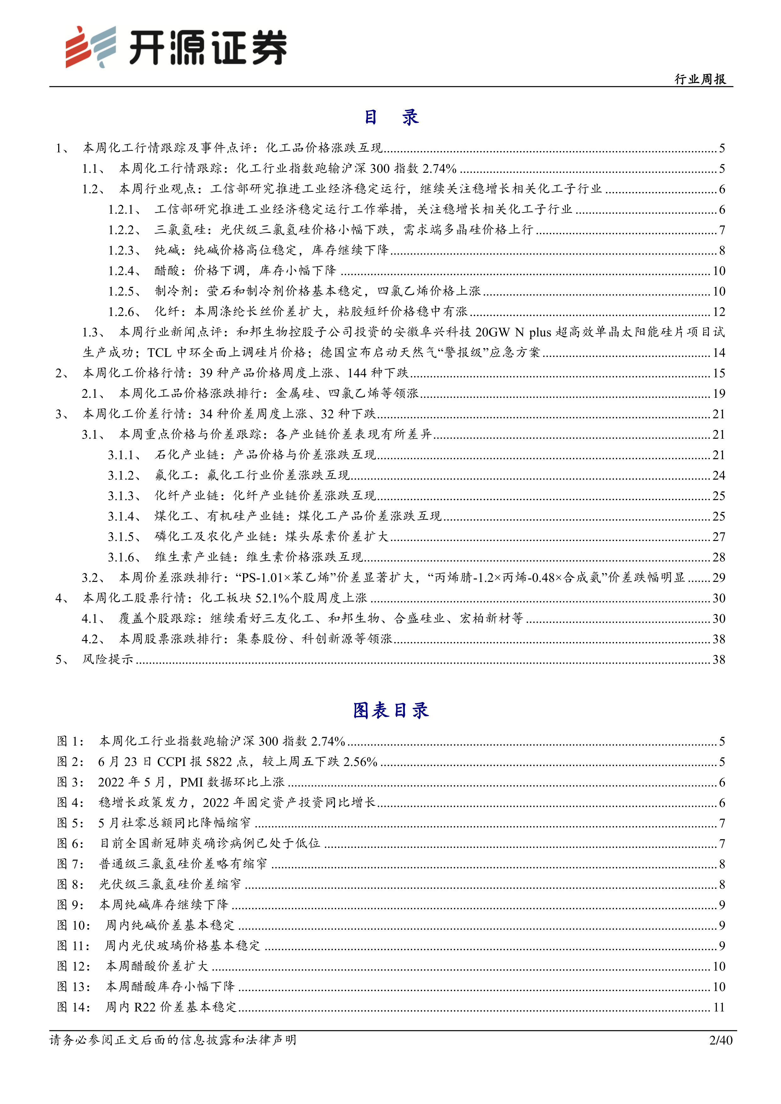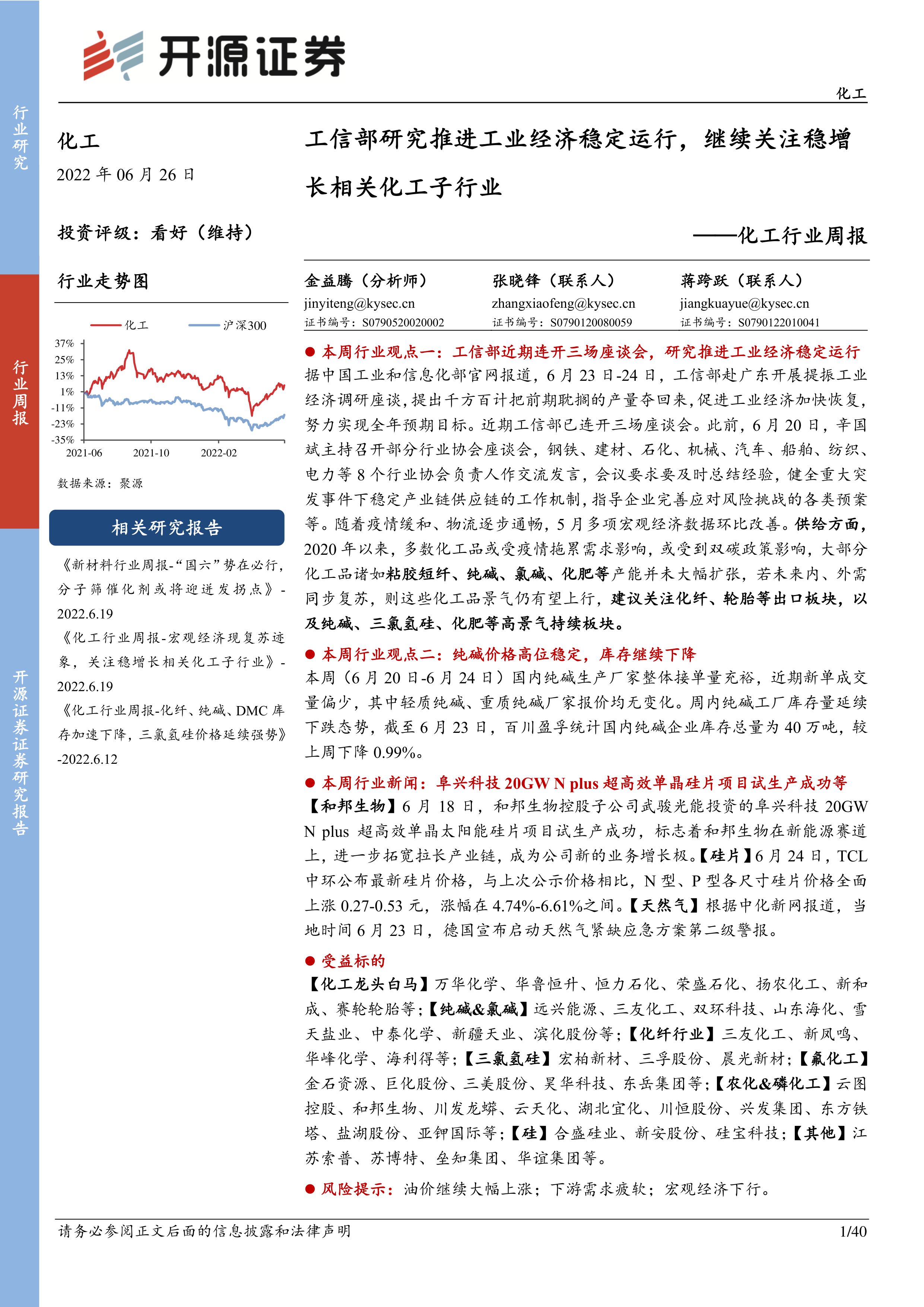 本报告的核心观点是:工信部积极采取措施,推动工业经济稳定运行,关注稳增长相关化工子行业,为化工行业发展带来积极信号。 纯碱、三氯氢硅等部分化工产品价格保持高位或稳中有涨,库存持续下降,行业景气度较高。但宏观经济下行、下游需求疲软以及油价上涨等风险依然存在。