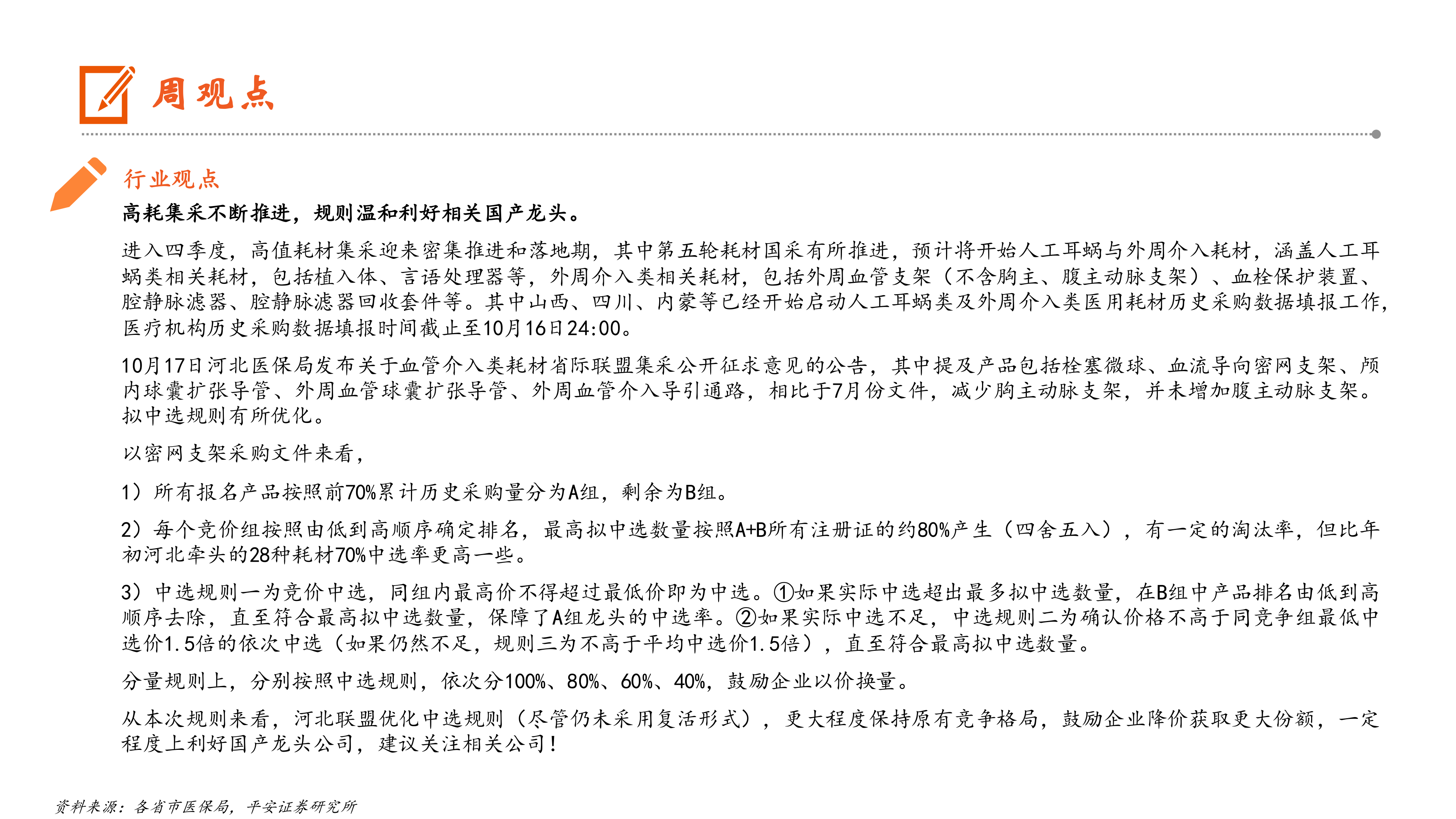 进入四季度,高值耗材集采迎来密集推进和落地期,其中第五轮耗材国采有所推进,预计将开始人工耳蜗与外周介入耗材,涵盖人工耳