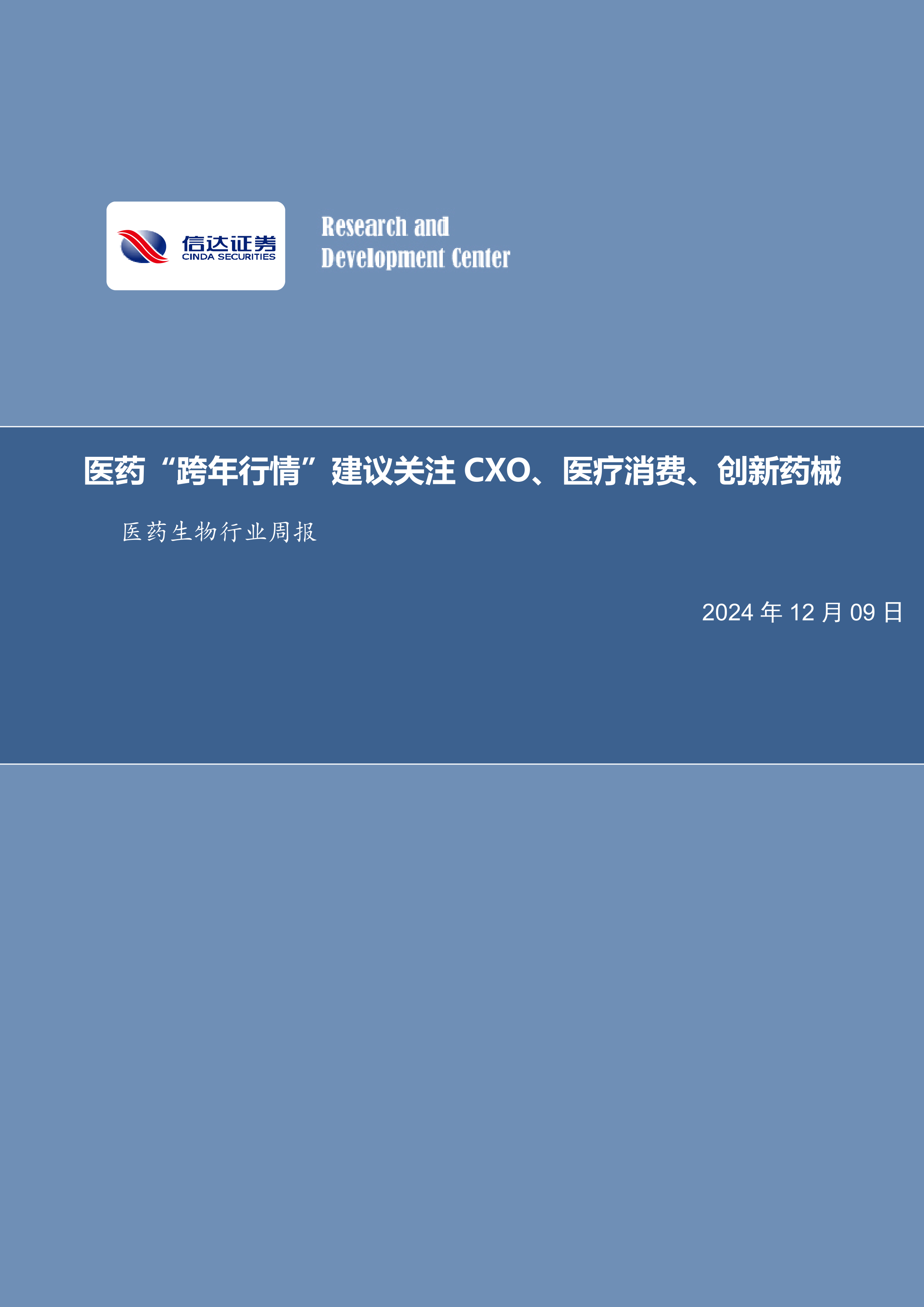 周观点:当前市场预期12月中旬召开中央经济工作会议,“扩内需”、“新质生产力”、“国企改革”等仍为核心关键词。此外,周末美国国会参众两院军事委员会公布了2025财年国防授权法案(NDAA),该版本显示生物安全法案未被列入其中。我们认为,在美国生物安全法案未被列入NDAA的事件催化下,CXO板块有望迎来新一轮估值修复。此外,我们认为2025年医药板块整体有望迎来业绩修复,一方面系医保支付端存在边际改善趋势(诸如商业医保或有增量贡献),另一方面系2024年医药板块的低基数效应。结合当下的市场氛围,我们认为可以围绕“扩内需”+“新质生产力”+“国企改革”进行选股。