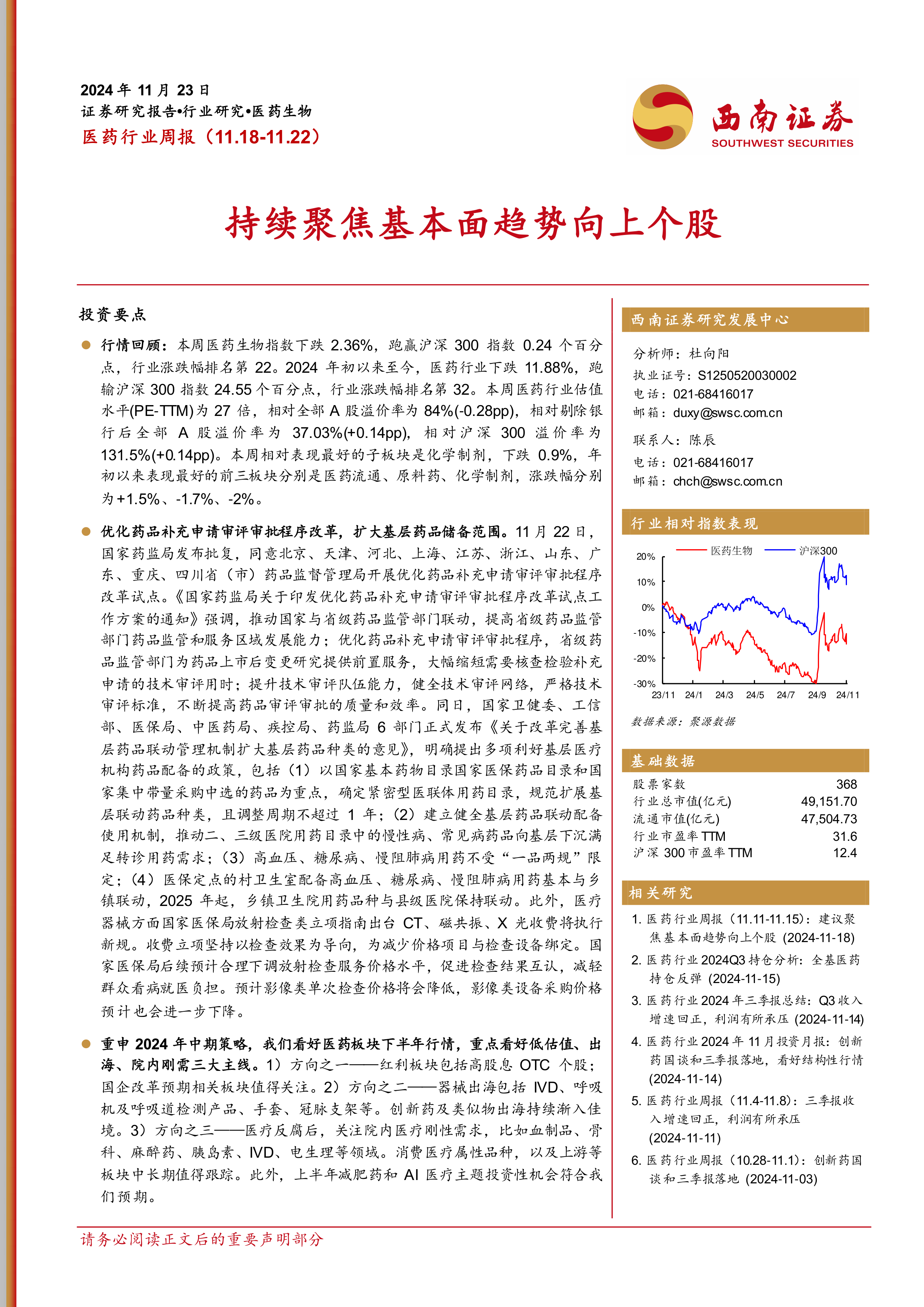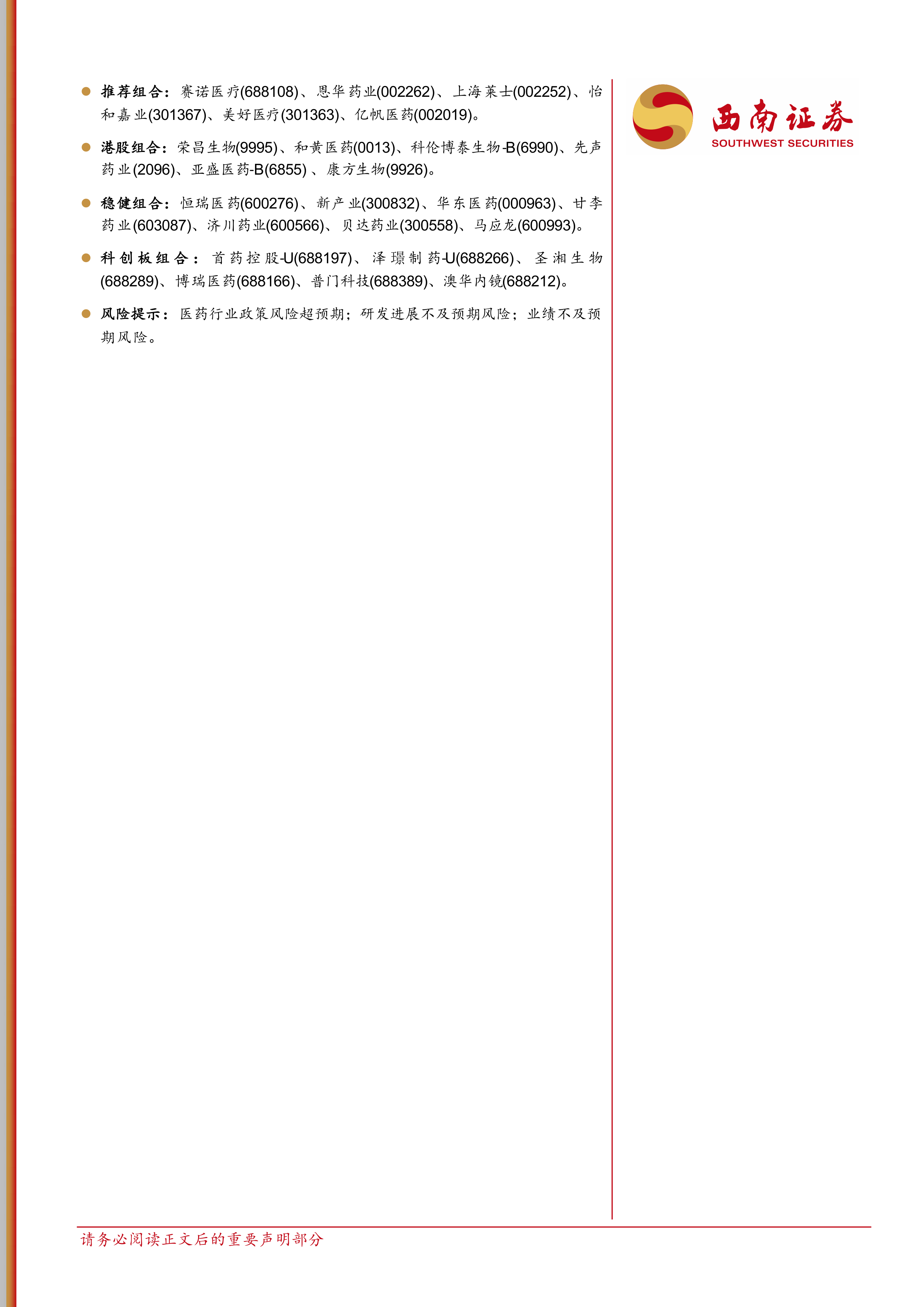 风险提示:医药行业政策风险超预期;研发进展不及预期风险;业绩不及预期风险。