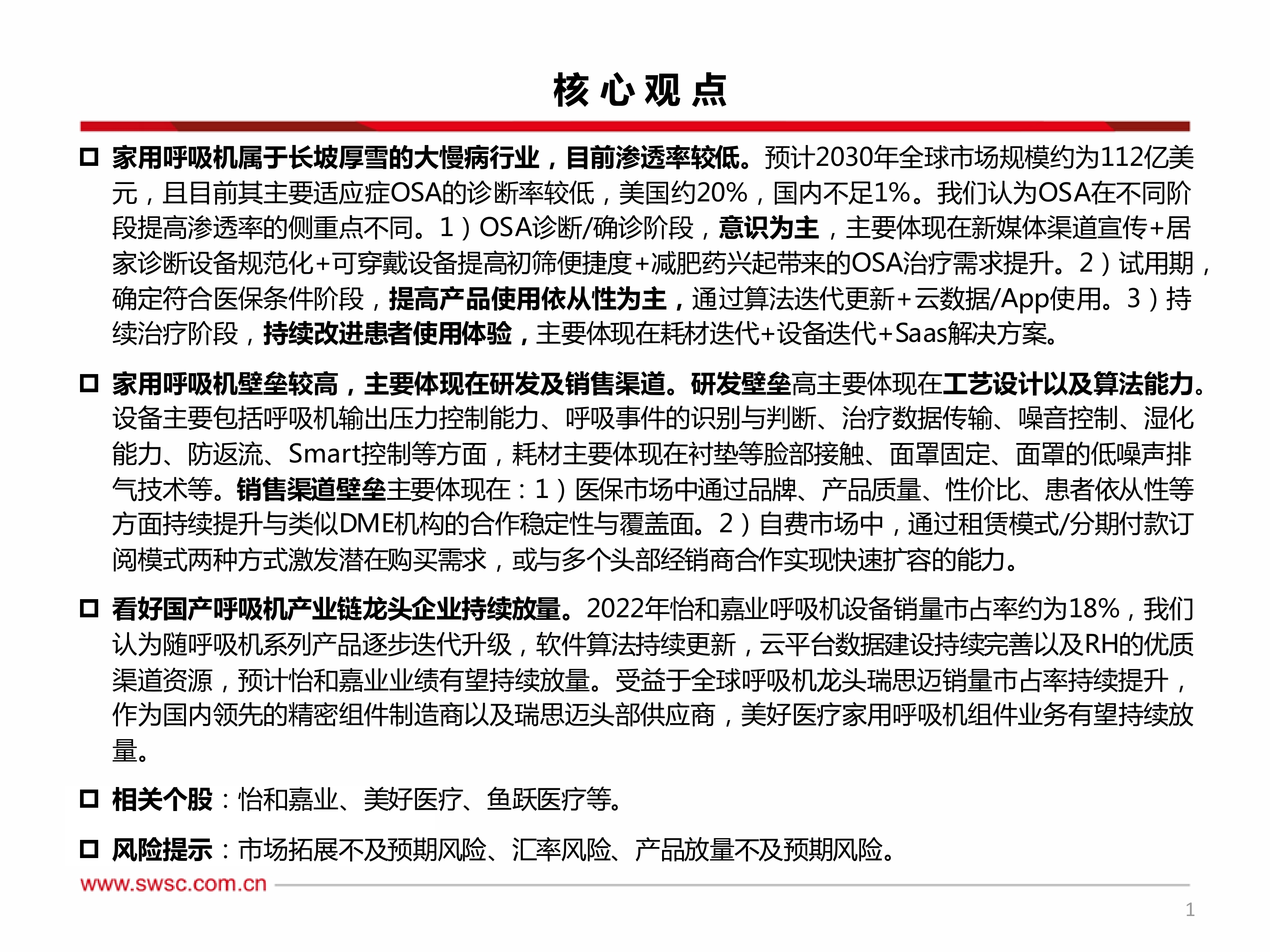 本报告的核心观点是:家用呼吸机市场潜力巨大,属于长坡厚雪的大慢病行业,但渗透率较低。国产呼吸机企业凭借技术迭代、渠道拓展和互联网医疗模式的应用,有望在全球市场持续放量,其中怡和嘉业、美好医疗等企业值得关注。报告从市场规模、疾病概览、渗透率提升策略、产品壁垒、企业竞争格局等多个维度进行了深入分析,并指出了潜在的风险。