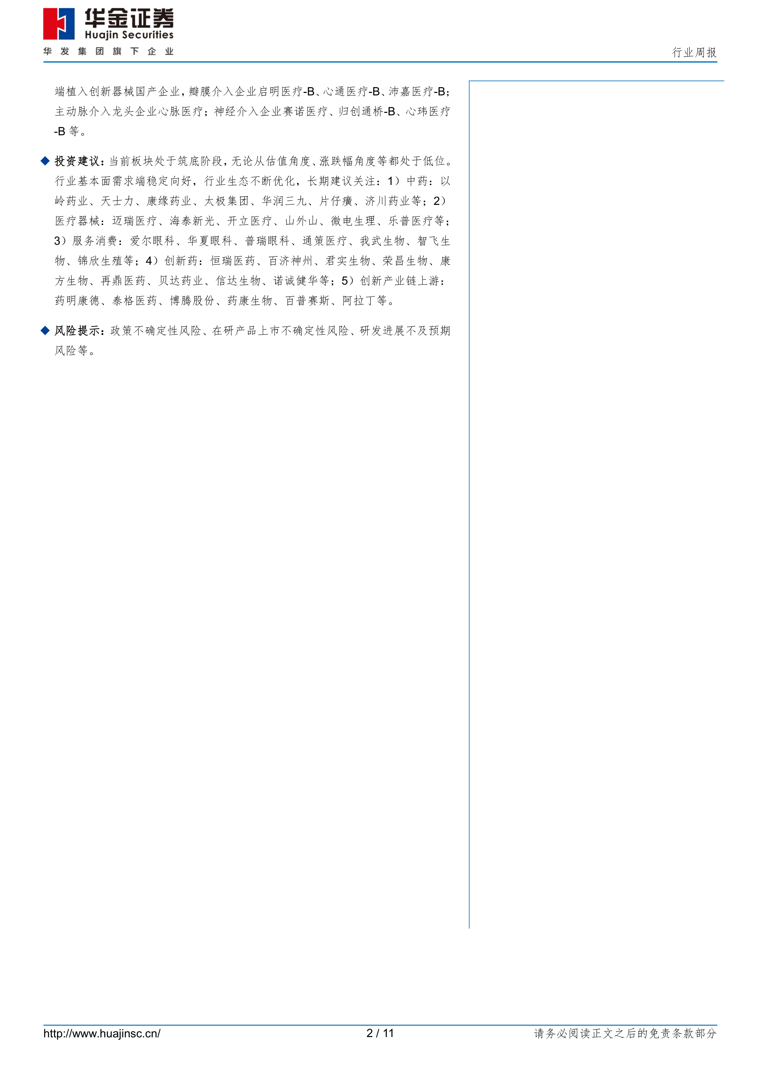 投资建议:当前板块处于筑底阶段,无论从估值角度、涨跌幅角度等都处于低位。行业基本面需求端稳定向好,行业生态不断优化,长期建议关注:1)中药:以岭药业、天士力、康缘药业、太极集团、华润三九、片仔癀、济川药业等;2)医疗器械:迈瑞医疗、海泰新光、开立医疗、山外山、微电生理、乐普医疗等;3)服务消费:爱尔眼科、华夏眼科、普瑞眼科、通策医疗、我武生物、智飞生物、锦欣生殖等;4)创新药:恒瑞医药、百济神州、君实生物、荣昌生物、康方生物、再鼎医药、贝达药业、信达生物、诺诚健华等;5)创新产业链上游:药明康德、泰格医药、博腾股份、药康生物、百普赛斯、阿拉丁等。