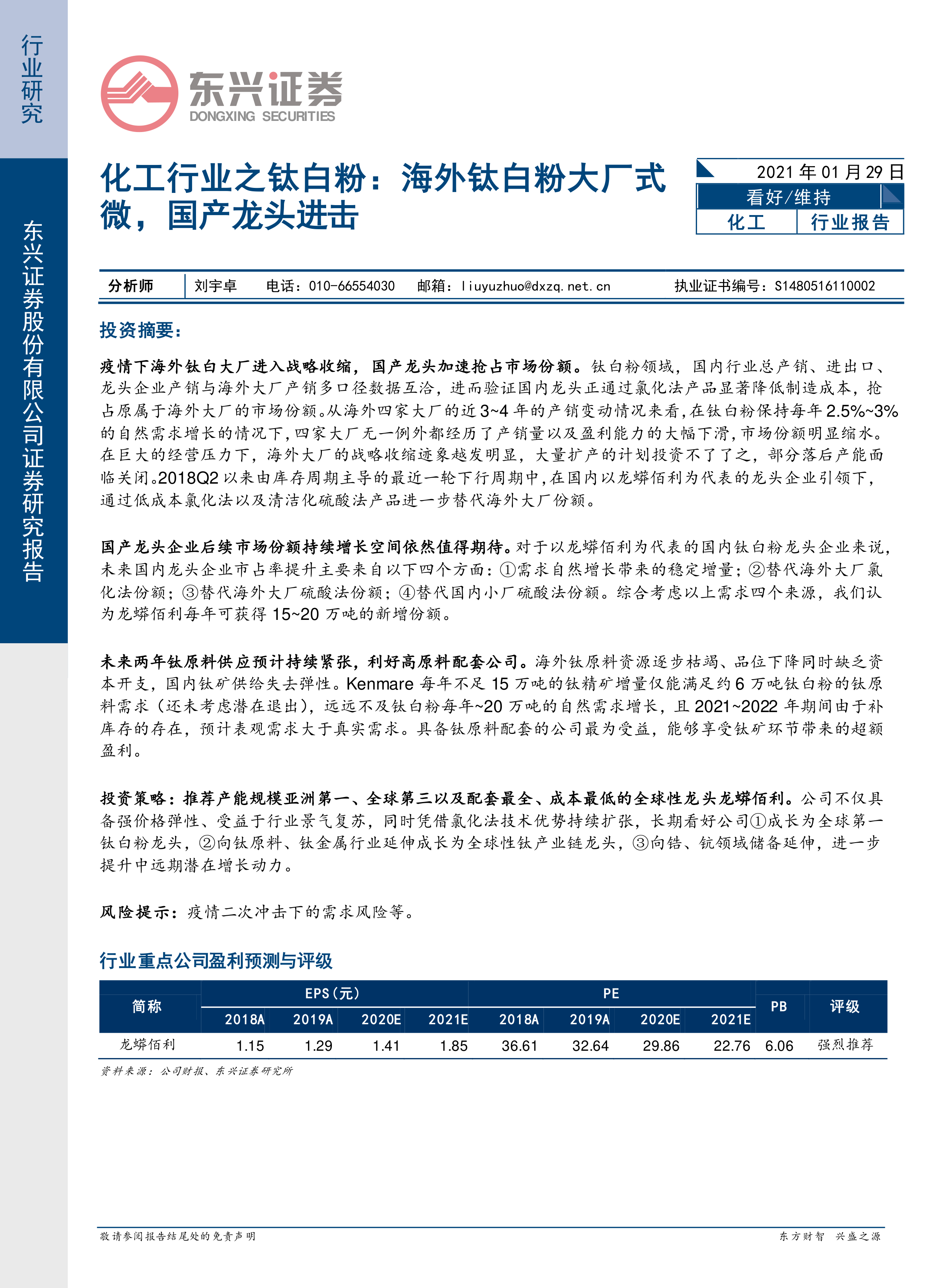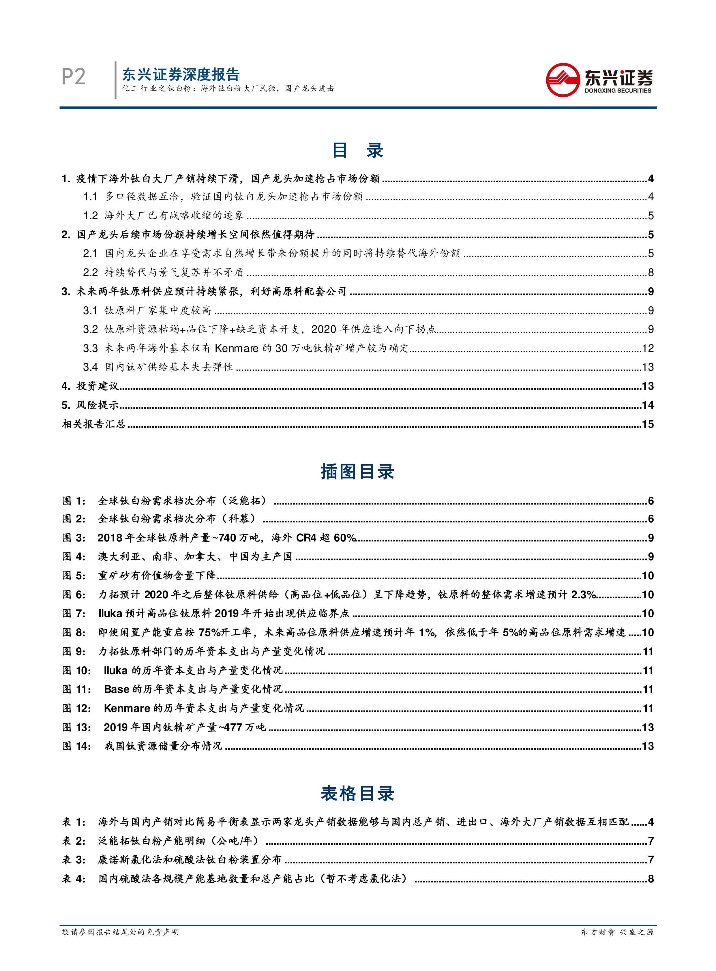 本报告的核心观点是:疫情导致海外钛白粉大厂战略收缩,为国产龙头企业抢占市场份额提供了绝佳机遇。龙蟒佰利等国内龙头企业凭借低成本氯化法技术和清洁化硫酸法产品,正在迅速替代海外大厂的市场份额,未来增长空间巨大。同时,钛原料供应紧张的局面也为具备钛原料配套能力的公司带来了超额盈利机会。