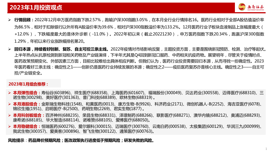 本报告基于西南证券研究发展中心的数据和分析,对2022年医药行业市场表现进行了全面回顾,并对2023年医药行业投资策略进行了展望。报告认为,2023年医药行业投资需回归本源,重点关注创新、复苏和自主可控三条主线,同时需谨慎评估药品降价、医改政策执行和研发失败等风险。报告还提供了2023年1月不同类型的投资组合推荐,为投资者提供了参考。 需要注意的是,报告中的信息和观点仅供参考,不构成投资建议,投资者应自行承担投资风险。