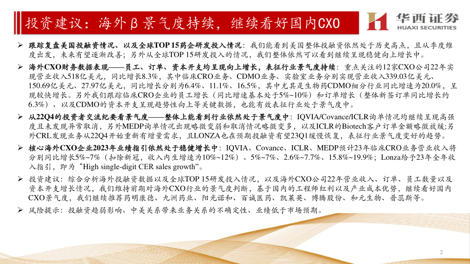 报告最后给出了投资建议,继续看好国内外CXO行业,并推荐了多家国内CXO公司。同时,也指出了投融资趋弱、中美关系不确定性以及业绩低于市场预期等潜在风险。