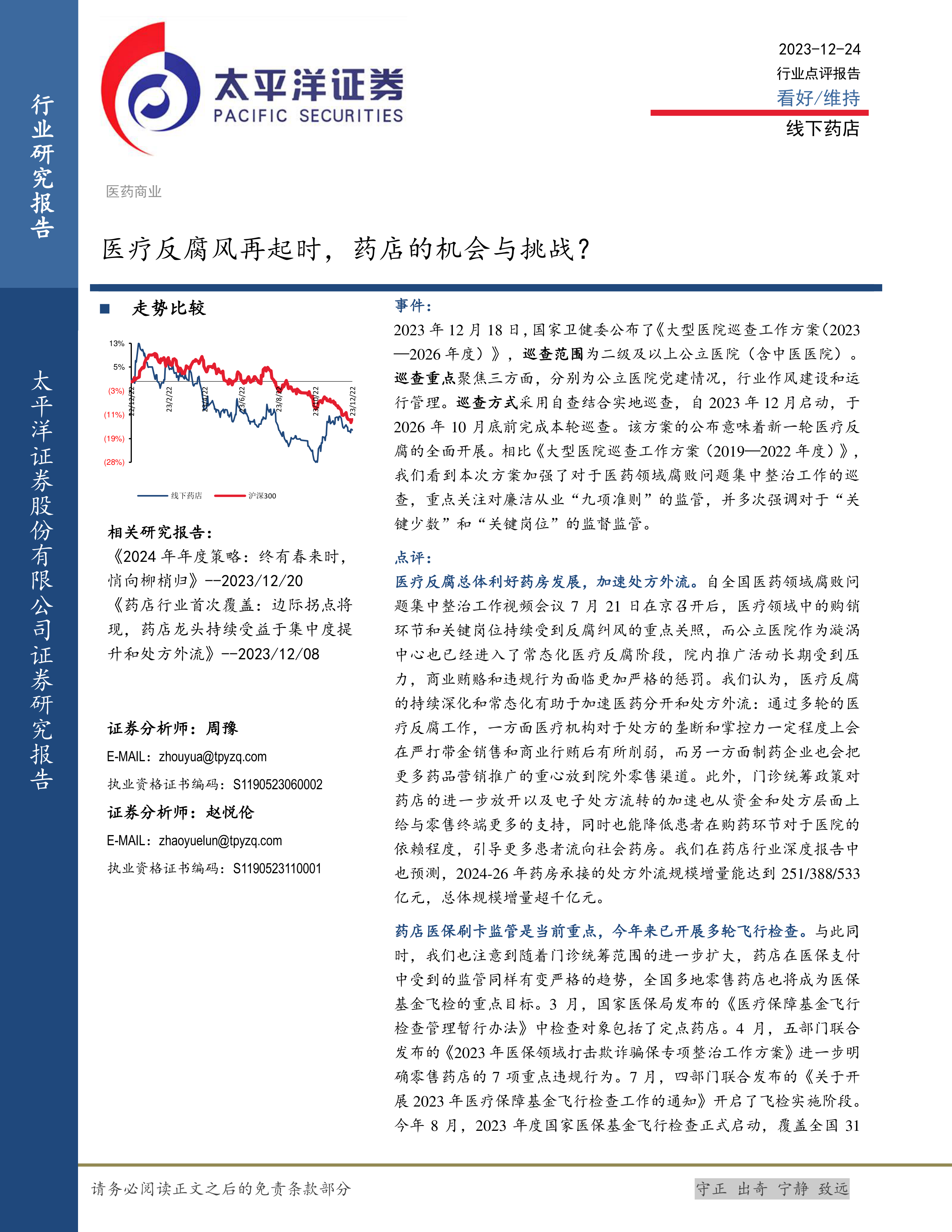 报告指出,2023年国家卫健委公布的《大型医院巡查工作方案(2023-2026年度)》标志着新一轮医疗反腐的全面开展,重点关注医药领域腐败问题,加强对“关键少数”和“关键岗位”的监督监管。 自7月以来,医疗领域购销环节和关键岗位持续受到反腐纠风的重点关照,院内推广活动受到压制,商业贿赂和违规行为面临更严格的惩罚。 这将加速医药分开和处方外流,削弱医疗机构对处方的垄断,并促使制药企业将更多营销重心转向院外零售渠道。