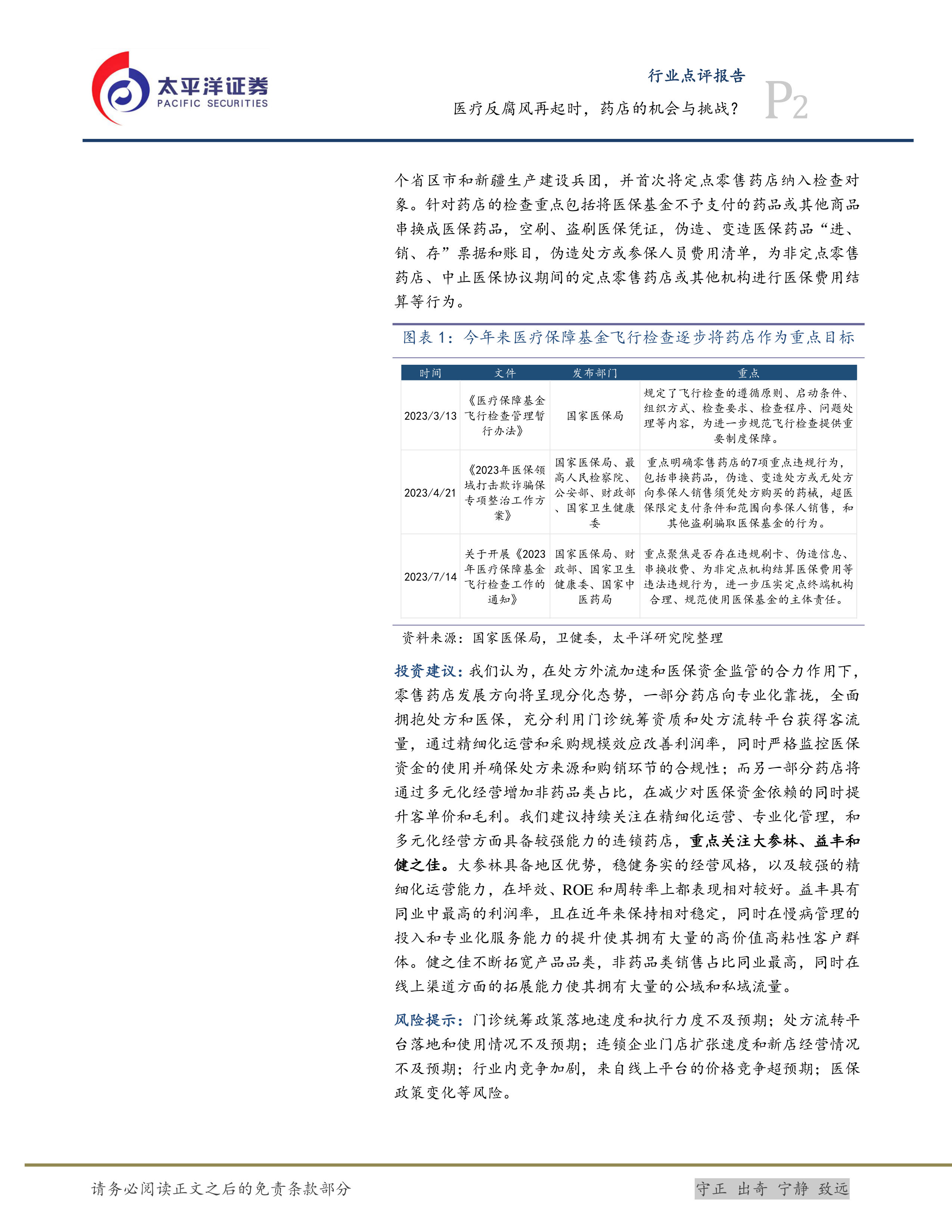 投资建议:我们认为,在处方外流加速和医保资金监管的合力作用下,零售药店发展方向将呈现分化态势,一部分药店向专业化靠拢,全面拥抱处方和医保,充分利用门诊统筹资质和处方流转平台获得客流量,通过精细化运营和采购规模效应改善利润率,同时严格监控医保资金的使用并确保处方来源和购销环节的合规性;而另一部分药店将通过多元化经营增加非药品类占比,在减少对医保资金依赖的同时提升客单价和毛利。我们建议持续关注在精细化运营、专业化管理,和多元化经营方面具备较强能力的连锁药店,重点关注大参林、益丰和健之佳。大参林具备地区优势,稳健务实的经营风格,以及较强的精细化运营能力,在坪效、ROE和周转率上都表现相对较好。益丰具有同业中最高的利润率,且在近年来保持相对稳定,同时在慢病管理的投入和专业化服务能力的提升使其拥有大量的高价值高粘性客户群体。健之佳不断拓宽产品品类,非药品类销售占比同业最高,同时在线上渠道方面的拓展能力使其拥有大量的公域和私域流量。