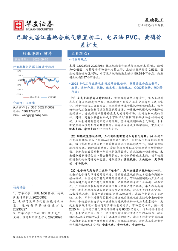 基础化工行业周报:巴斯夫湛江基地合成气装置动工,电石法PVC、黄磷价差扩大
