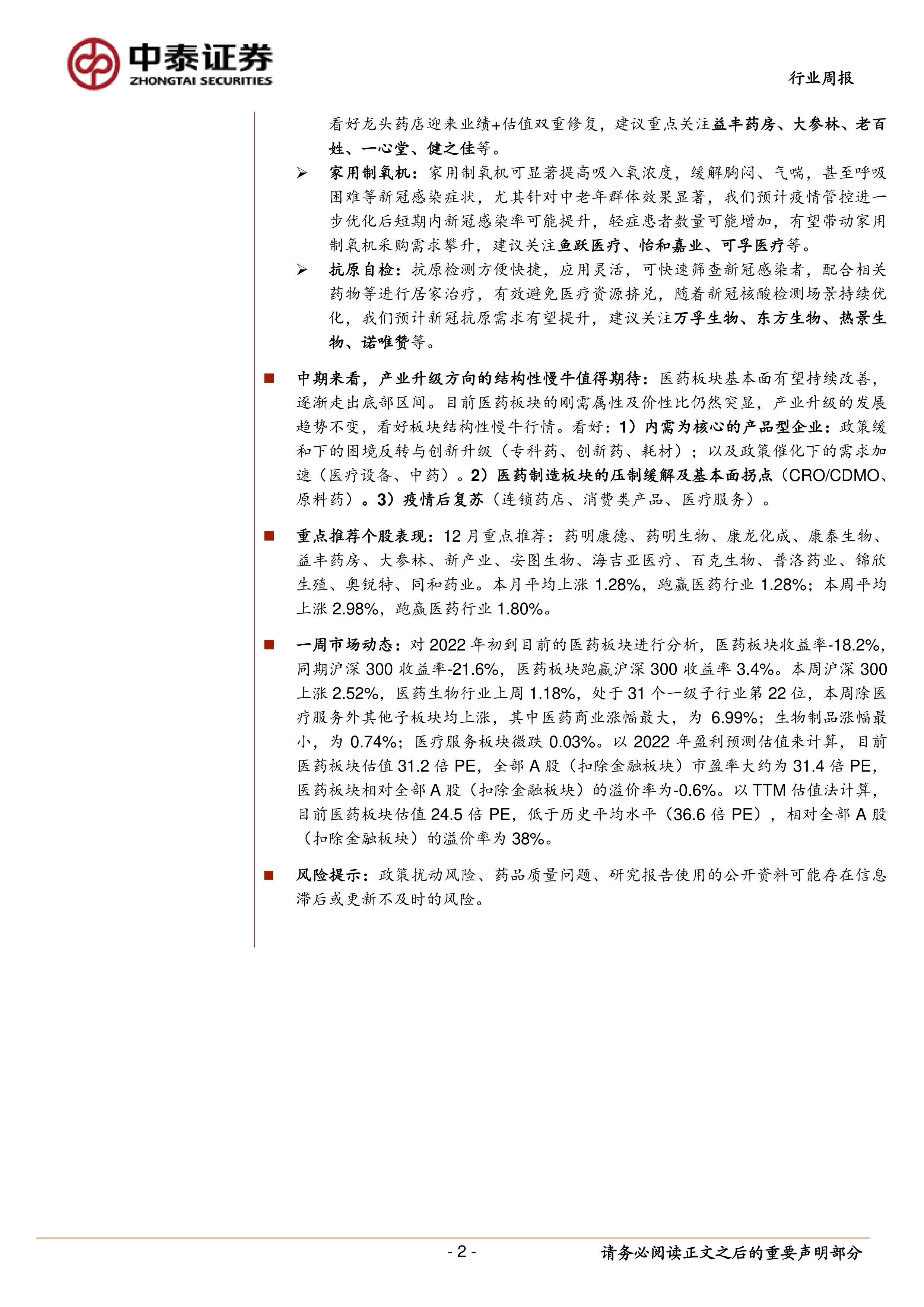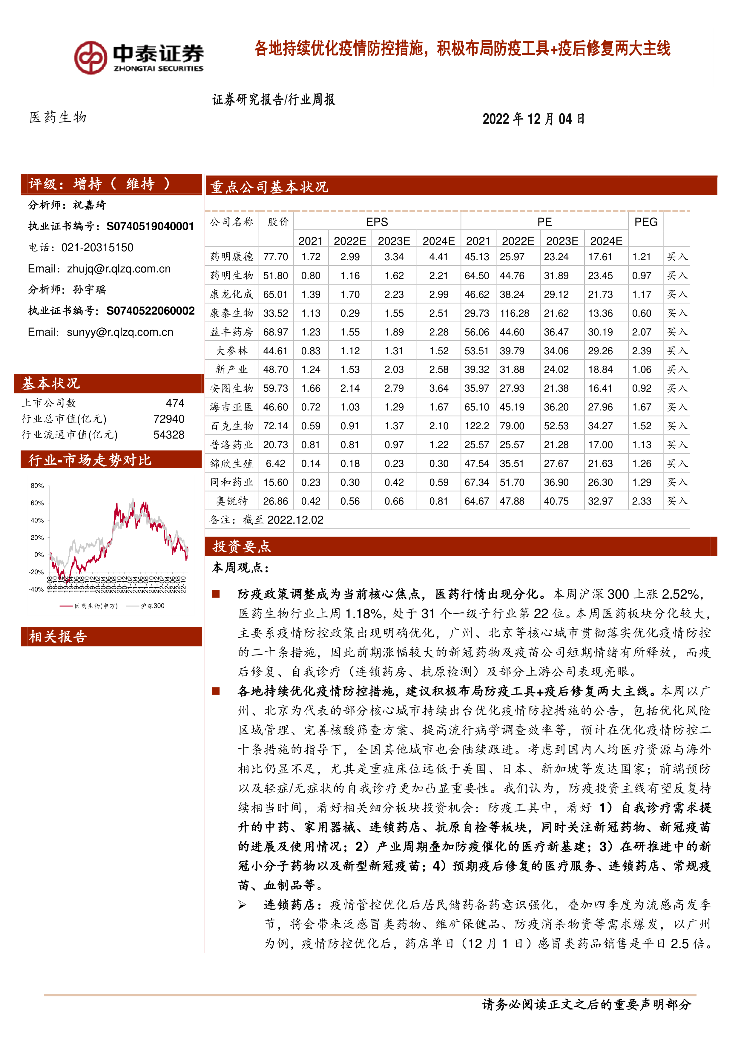 本报告基于公开数据和市场分析,对医药行业在疫情防控政策优化后的市场表现、投资机会以及行业热点进行了深入解读。报告认为,医药行业将持续分化,建议投资者关注“防疫工具+疫后修复”两大主线,并重点关注报告中推荐的个股和板块。 同时,报告也提示了政策扰动风险、药品质量问题等潜在风险。 投资者需谨慎决策,独立判断。