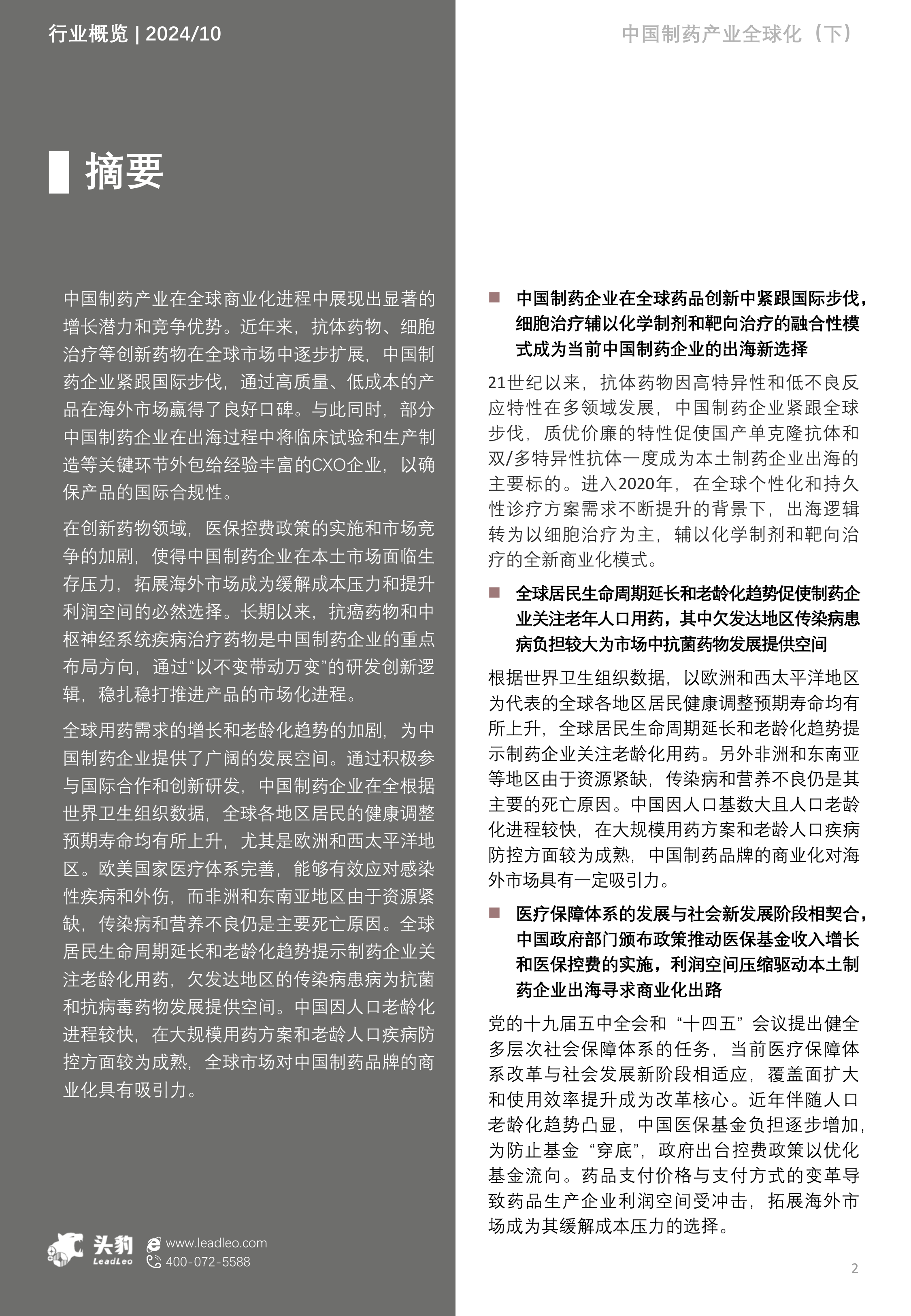 本报告的核心观点是中国制药产业的全球化进程正加速推进,并展现出显著的增长潜力和竞争优势。这一趋势主要由以下几个因素驱动: