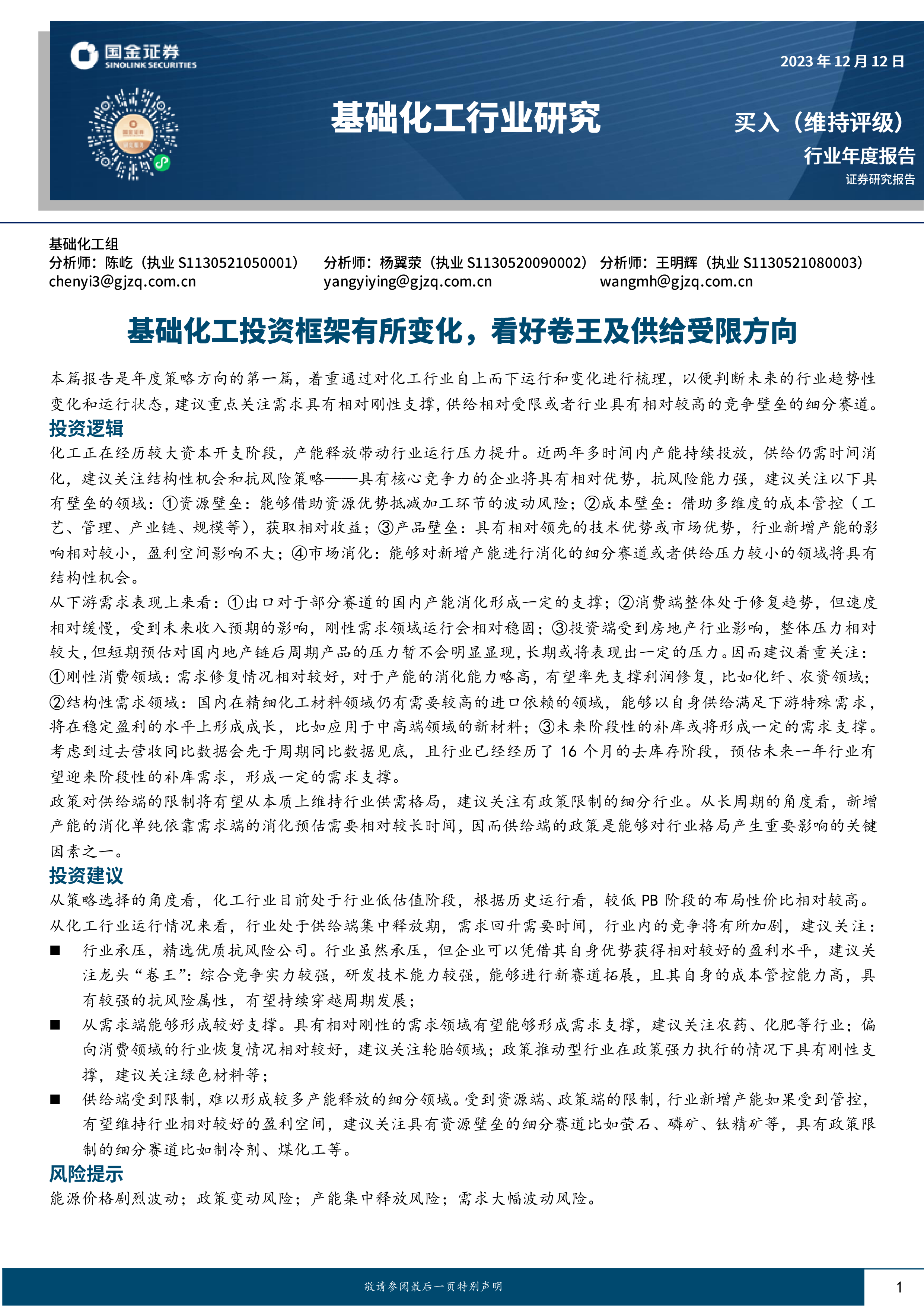 基础化工行业年度报告:基础化工投资框架有所变化,看好卷王及供给受限方向