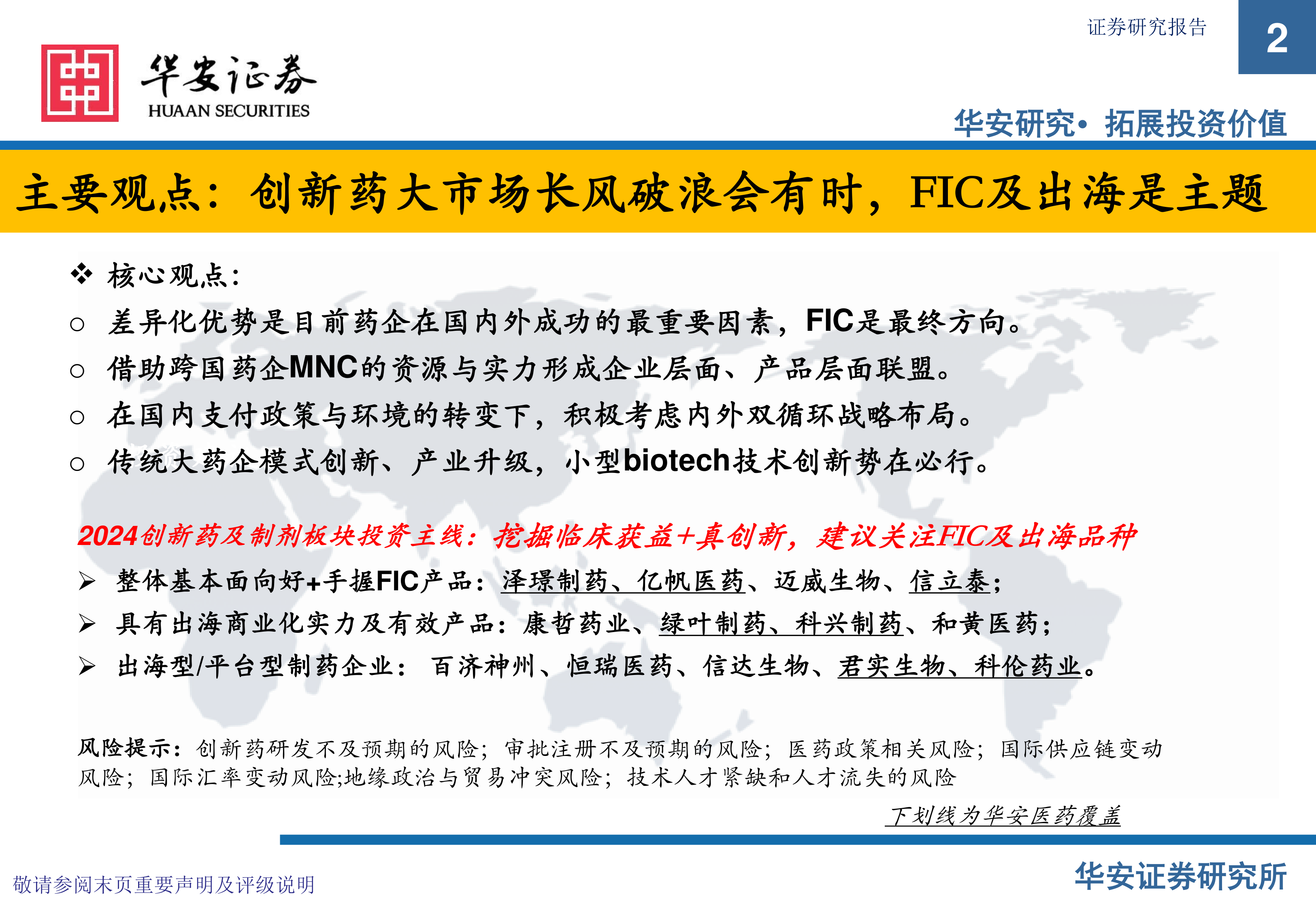 差异化优势是目前药企在国内外成功的最重要因素,FIC是最终方向。